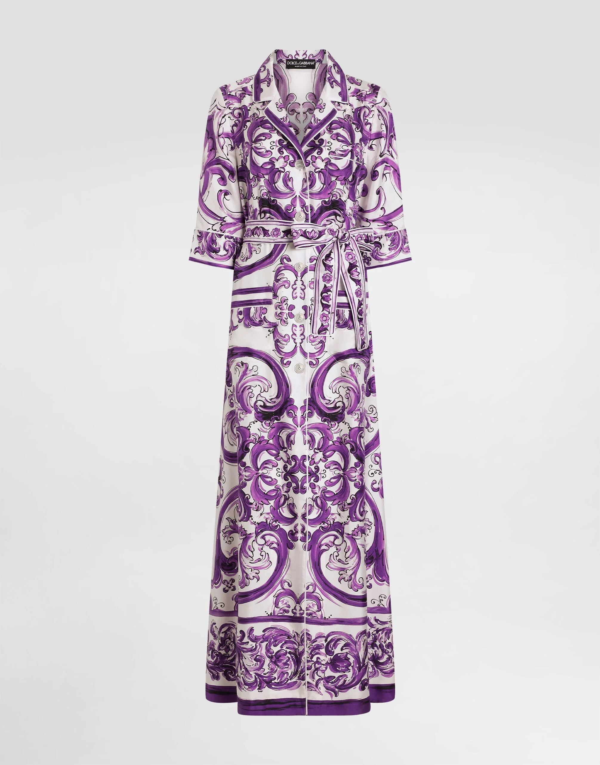This long printed silk dressing gown is a garment that combines elegance and comfort, ideal for those looking for a sophisticated and distinctive look. Long silk dressing robe with Majolica print: • Multi-coloured • Lapel collar • Elbow-length sleeve with wrist • Single-breasted • Side pockets • Contrasting piping edges • The model is 175 cm tall and wears size 40 IT • Made in Italy The difference in the print placement that you may find on this product is a feature of Dolce&Gabbana’s “Handmade” pieces. A detail that makes every garment or accessory unique and exclusive. External Composition: 100% Silk