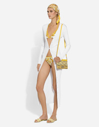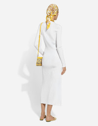 The Majolica, a symbol of Italian craftsmanship, comes in lemon yellow for the FW24/25 Girl’s Collection. This vibrant hue, brightened up by pure white, evokes summer light dancing on the quintessential Sicilian homes that look out to the sea. Evocative color detailing that adds a bold edge to iconic accessories and pieces that are extraordinarily feminine and vibrant. A tribute to the majolica art that, once again, enhances Dolce&Gabbana aesthetic rules. Long ribbed viscose cardigan: • White • 18-gauge knit • V-neck • Long sleeves • Form fitting • Fine-rib trims • Button fastenings at the front • The piece measures 135 cm from the shoulder seam on a size IT 40 • The model is 175 cm tall and wears a size IT 40 • Made in Italy External composition: 73% Viscose 15% Polyester 9% Polyamide 3% Spandex