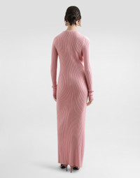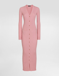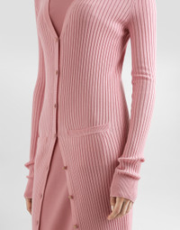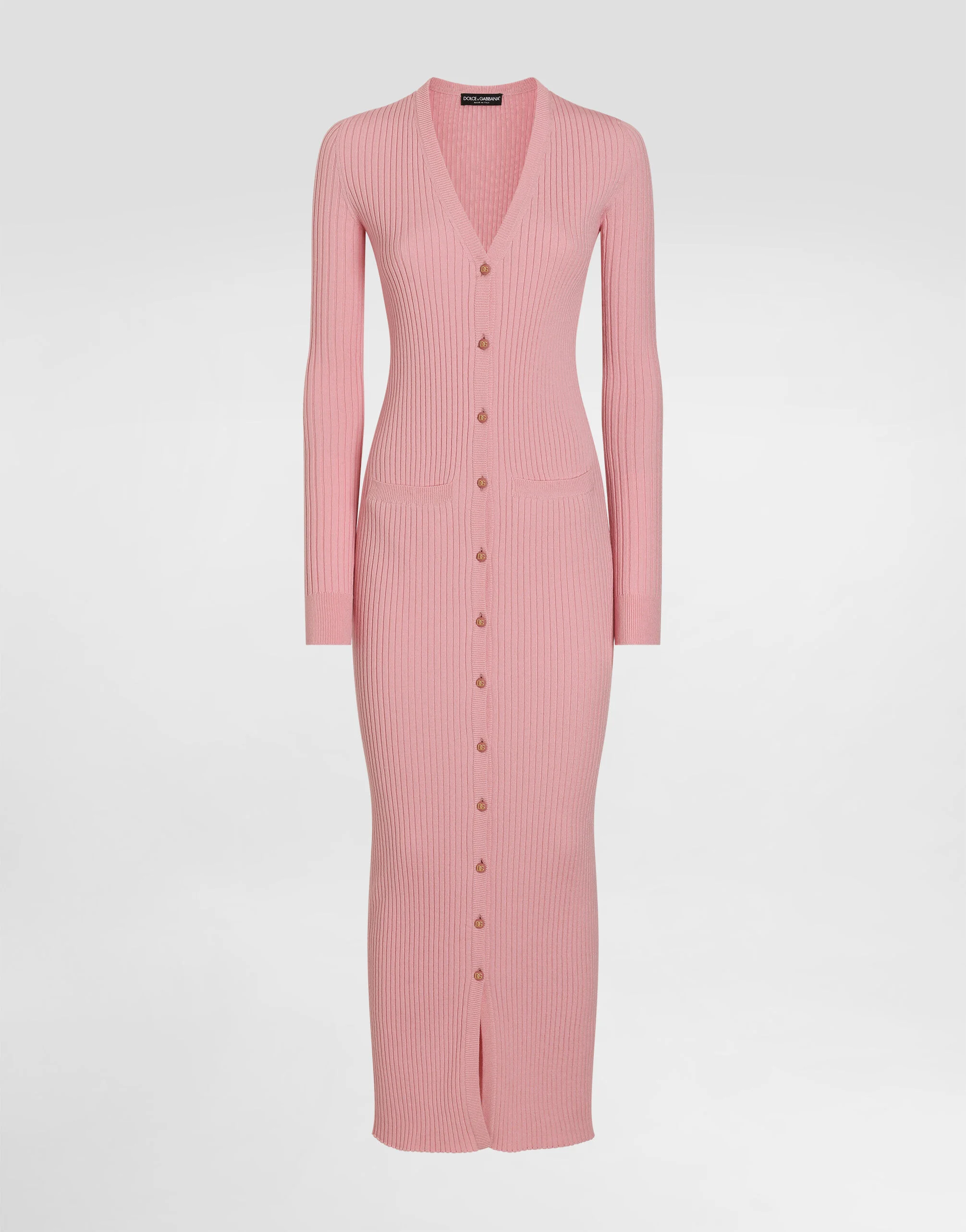 The Women’s DNA Collection is introducing a new side to femininity, which comes in shades of rose quartz, poised between sheerness and opacity, lightness and structure, formality and sensuality. Geometric Dolce Jackets, jacquard pajamas and floral brocade dresses intertwine with ultra-romantic designs. The DG print becomes an iconic statement, while Cordonetto lace and hints of Sicily Black embody the essence of a determined yet romantic femininity. Long ribbed wool cardigan: • Pink • 14-gauge knit • V-neckline • Long sleeves • Pockets • Dense hand • Form fitting • Button fastenings • The piece measures 130 cm from the shoulder seam on a size IT 40 • The model is 175 cm tall and wears a size IT 40 • Made in Italy External composition: 94% Virgin Wool 6% Polyester