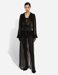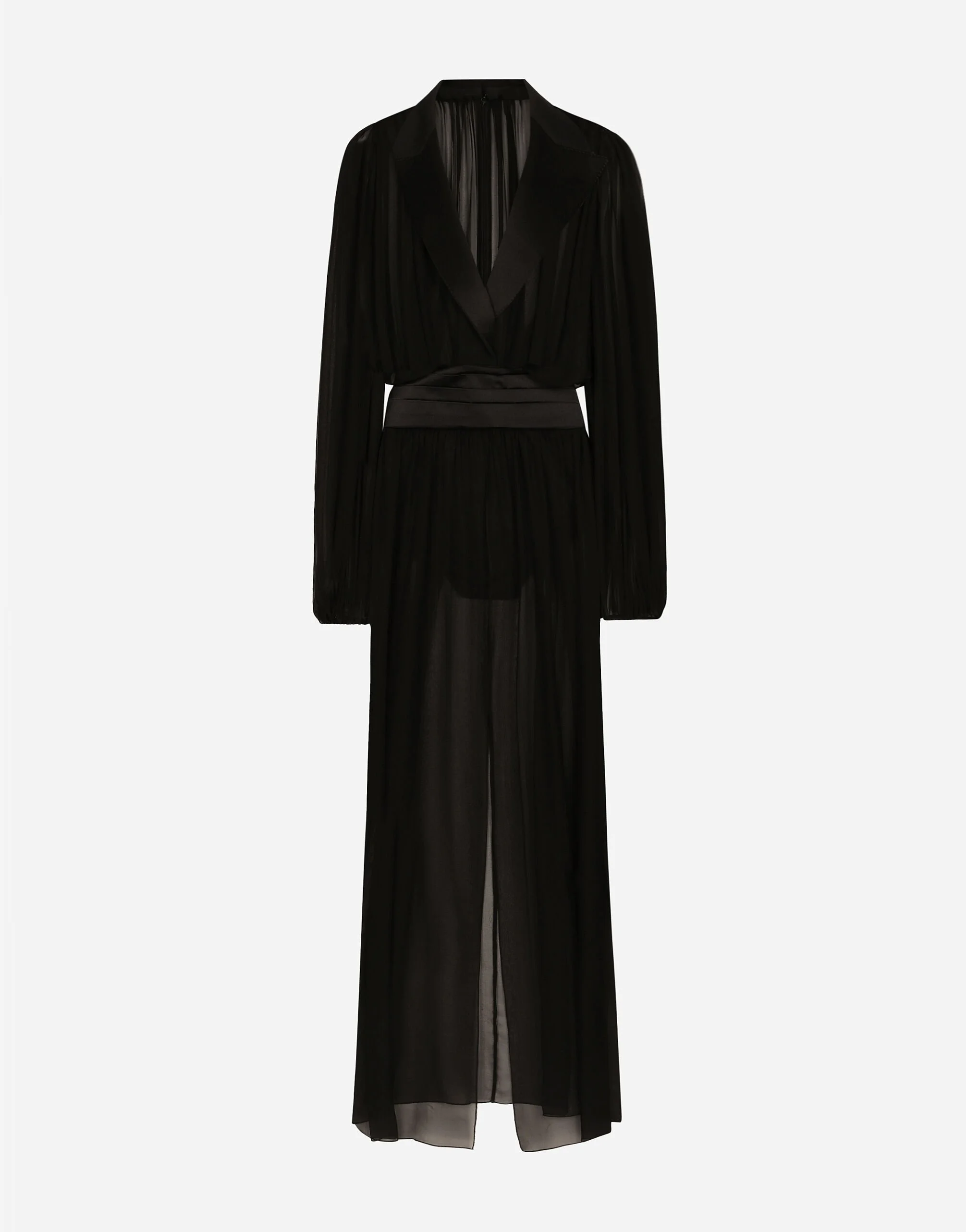 Menswear and womenswear mix and mingle, influencing one another and creating tailoring that embraces endless nuances, from the boldest to the most sophisticated, to define the rules of eternally classy femininity. A monochrome retelling in Nero Sicilia black, embellished by golden touches and rhinestones, adorning clean lines and incorporating stylish fabrics such as velvet, chiffon, lace, organza, and unique mesh details, the expression of authentic beauty for dresses, shirts and accessories. Long silk chiffon tuxedo dress: • Black • Satin peak lapels • Long sleeves with satin cuffs • Satin tuxedo belt • Detachable high-waisted stretch silk satin panties • Rear zipper and hook-and-bar fastening • The piece measures 117 cm from the waist down on a size IT 40 • The model is 175 cm tall and wears a size IT 40 • Made in Italy External composition: 88% Silk 10% Virgin Wool 02% Polyester Internal composition: 92% Silk 08% Spandex