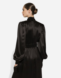 Menswear and womenswear mix and mingle, influencing one another and creating tailoring that embraces endless nuances, from the boldest to the most sophisticated, to define the rules of eternally classy femininity. A monochrome retelling in Nero Sicilia black, embellished by golden touches and rhinestones, adorning clean lines and incorporating stylish fabrics such as velvet, chiffon, lace, organza, and unique mesh details, the expression of authentic beauty for dresses, shirts and accessories. Long silk satin dress with front slit: • Black • Round neck with pussy-bow • Shoulder pads • Long sleeves • Pockets • Unlined • Zipper fastening at the back • The piece measures 118 cm from the waist down on a size IT 40 • The model is 175 cm tall and wears a size IT 40 • Made in Italy External composition: 100% Silk