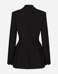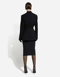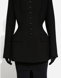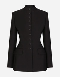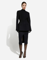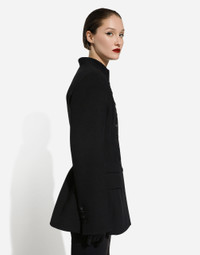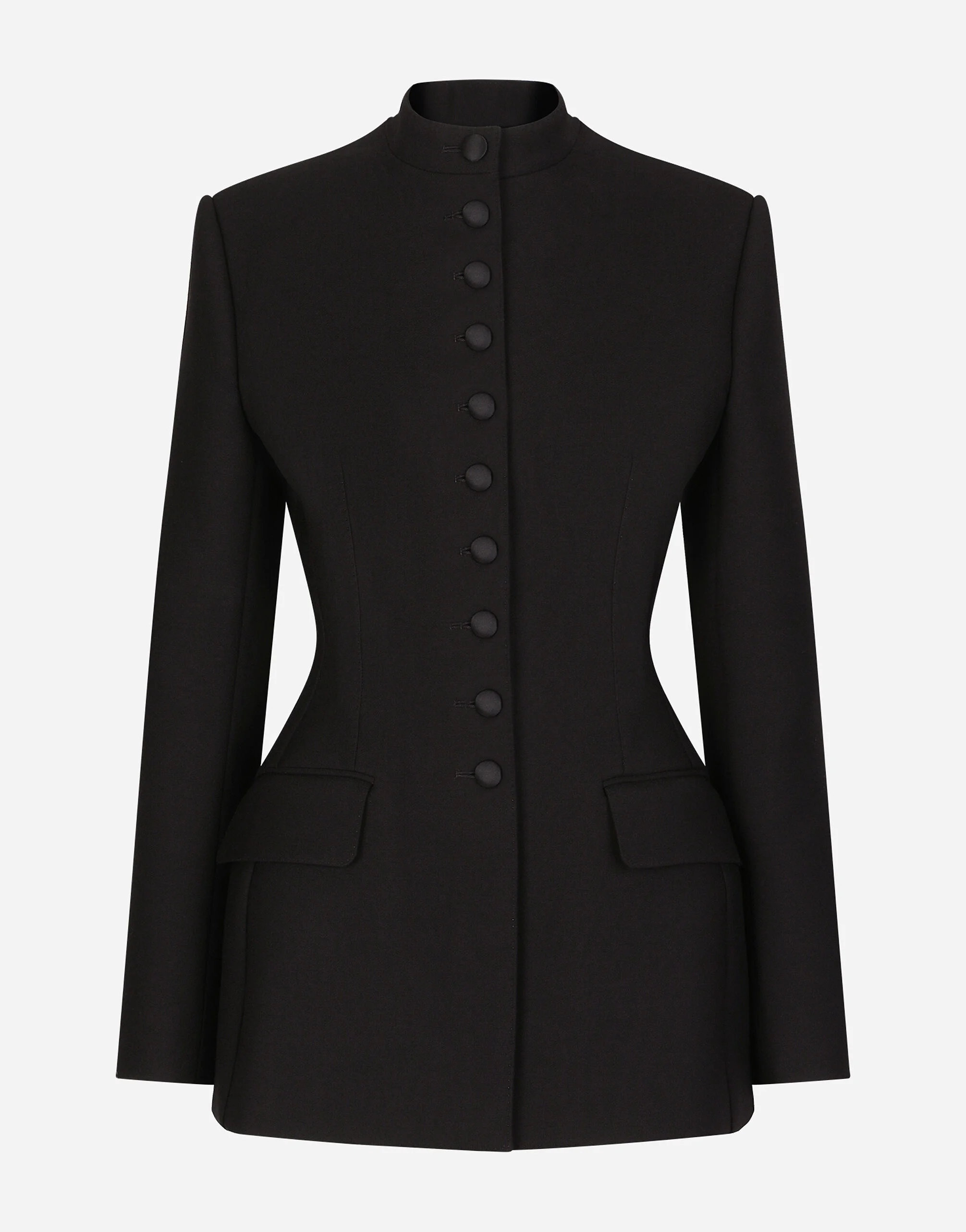 Long single-breasted wool cady Dolce-fit jacket: • Black • Mandarin collar • Long sleeves • Stretch silk satin lining • Covered button fastenings • Insulated padding on the sides • The piece measures 75 cm from the center back on a size IT 40 • The model is 175 cm tall and wears a size IT 40 • Made in Italy Care And Details External composition: 90% Virgin Wool 10% Polyamide Internal composition: 92% Silk 8% Spandex