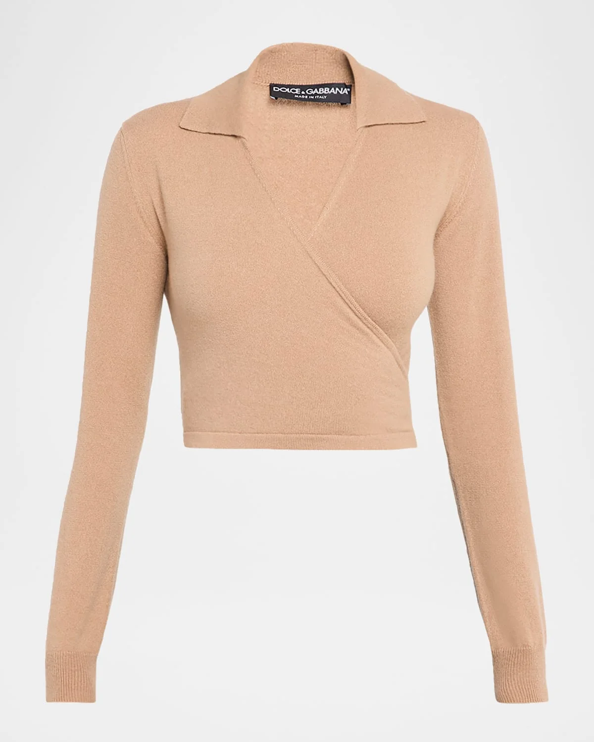 - Dolce&Gabbana knit wrap polo sweater - Spread collar; surplice front - Long sleeves - Fitted - Cropped length - Ribbed cuffs and hem - Pullover style - Cashmere - Made in Italy