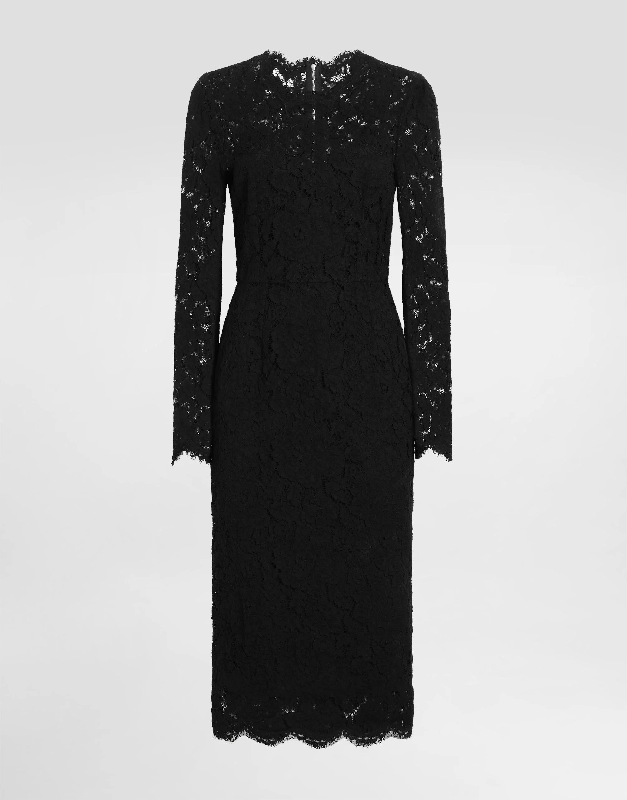 Dolce&Gabbana is creating a new DNA collection, using its style with a new concept of everyday elegance and apparel. Timeless, contemporary and traditional style. Lace is updated to become stretchy and embellished by the DG logo, making the garments feminine statement pieces that are full of character. Long-sleeved calf-length dress in branded stretch lace: • Round neck • Long sleeves • Stretch silk crepe de chine slip • Rear zipper and hook-and-eye fastening • The piece measures 75 cm from the waist down on a size IT 40 • The model is 175 cm tall and wears a size IT 40 • Made in Italy External composition: 51% Viscose 24% Cotton 20% Polyamide 5% Spandex Internal composition: 91% Silk 9% Spandex
