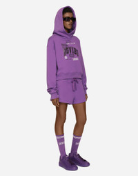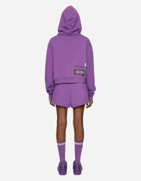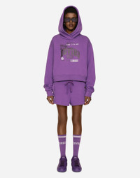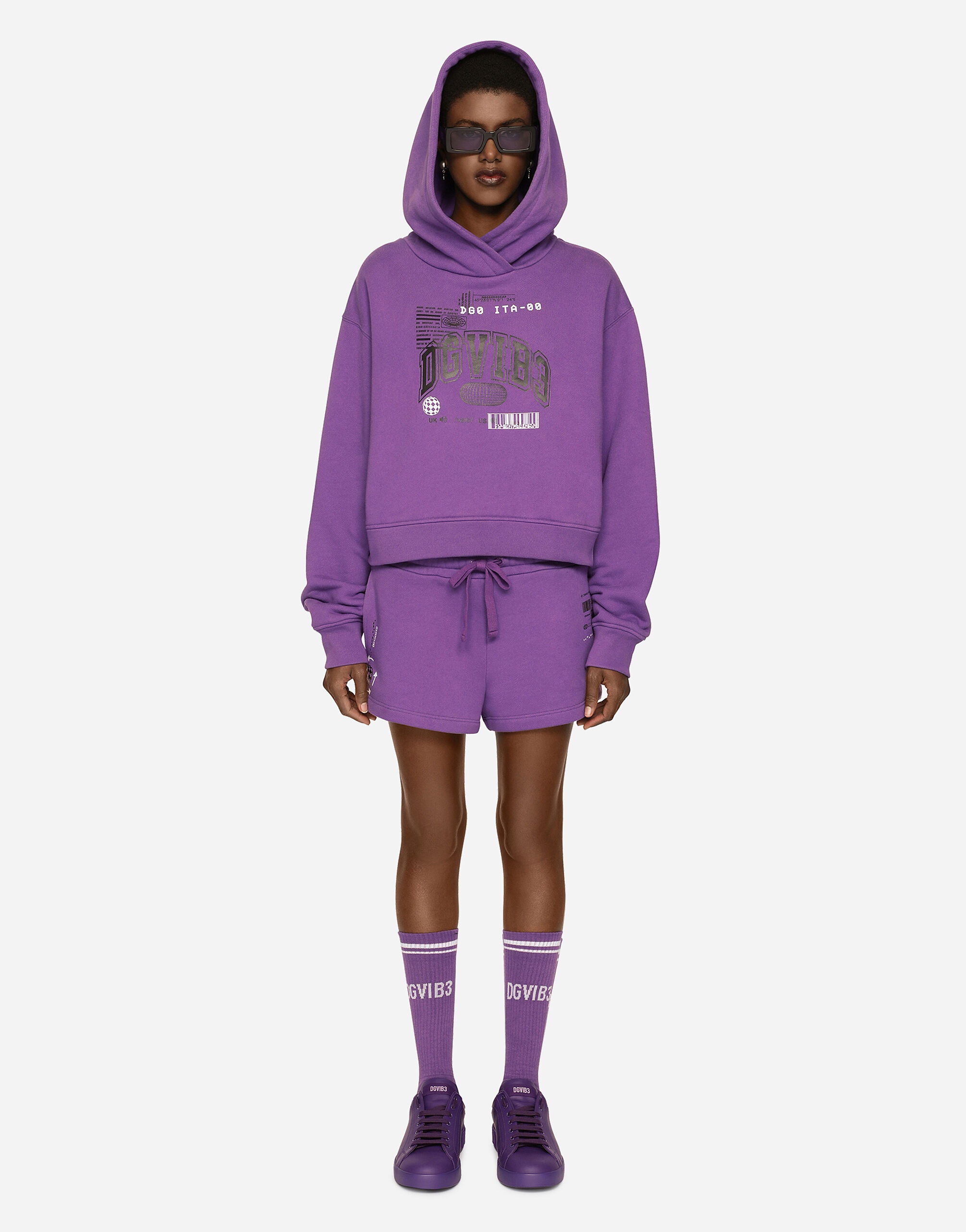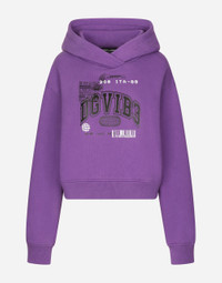 The new DGVIB3 collection is introducing us to the new language of Dolce&Gabbana: graphic taste and music are the keywords. All the prints, symbols, oversize volumes, new shapes, lengths and urban/street influences that we find in the collection are there precisely to recreate a unisex aesthetic, one that isn't tied to any specific physicality, yet with the specific desire to respect the characteristics of both sexes and convey a new and as-yet unexplored side of the Dolce&Gabbana world. Long-sleeved cotton jersey hoodie with DGVIB3 print: • Purple • With hood • Long sleeves • Ribbed hem and cuffs • Regular fit • The piece measures 50 cm from the center back on a size IT 40 • The model is 175 cm tall and wears a size IT 40 • Made in Italy External composition: 100% Cotton