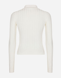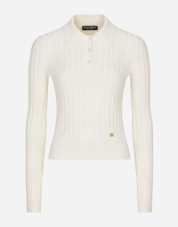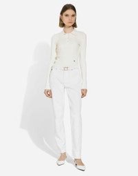 The Flowering Collection has us dreaming of faraway destinations, the most exclusive ones in the world, inviting us through the colors and the yellow rose print to take refuge in warm and unique places. Light White, lemon yellow, polka-dot accents and the various shades of leaf green for vibrant and ultra-feminine pieces where the keyword is tailoring. Every look invites us to savor and dream every moment of our free time, to discover beauty and enhance our femininity. Cropped ribbed viscose polo-shirt with DG logo: • White • 18-gauge knit • Polo-shirt-style collar • Long sleeves • Slim fit • Fine-rib trims • The piece measures 40 cm from the shoulder seam on a size IT 40 • The model is 175 cm tall and wears a size IT 40 • Made in Italy External composition: 83% Viscose 17% Polyamide