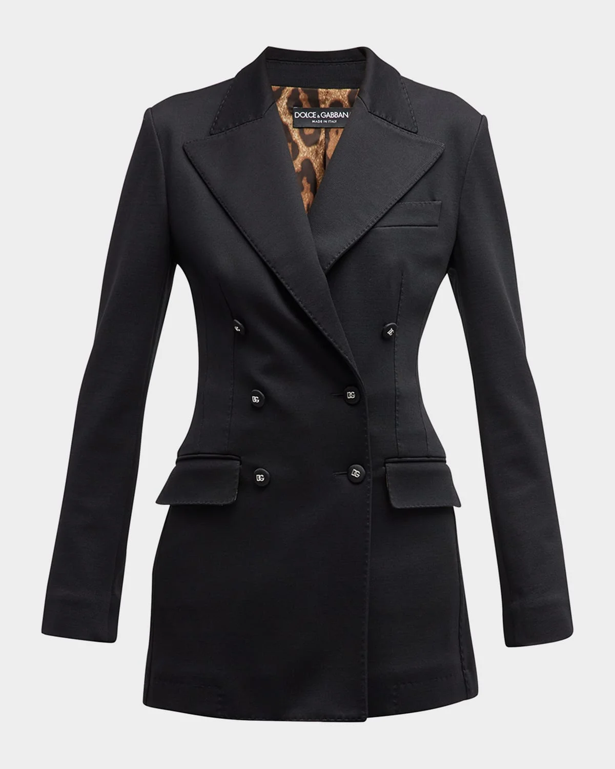 Dolceamp;Gabbana long blazer jacket with logo details on the buttons Notched collar Tworow button closure Long sleeves; button cuffs Side flap pockets Below the hip hem Viscose/polyamide/spandex Made in Italy