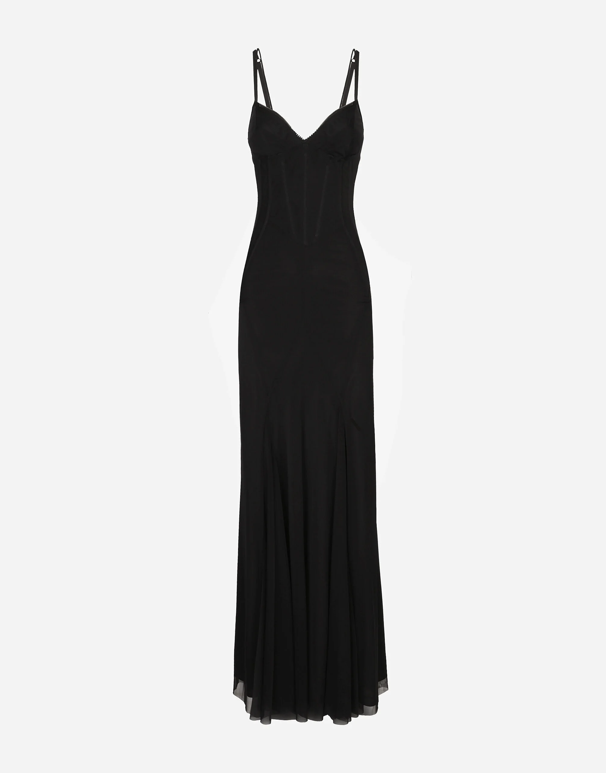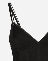 In the “WOMAN SS 24” Collection, the imagery of old Sicily interacts with the masculine, with sensual shapes, lace, nude tones and delicate overlays, to create pieces that move amid clean silhouettes, the elegance of the 1960s, the contrasts of black and white and luxurious textures. The designers are reworking their signature style and their iconic Sicilia black color to convey an aware, seductive and confident Sicilian WOMAN who is imbued with sensuality. Long tulle slip dress with corset details: • Black • V-neck • Sleeveless with spaghetti straps • Boned bodice • Stretch silk crepe de chine slip • Rear zipper and hook-and-eye fastening • The piece measures 118 cm from the waist down on a size IT 40 • The model is 175 cm tall and wears a size IT 40 • Made in Italy External composition: 74% Polyamide 16% Spandex 10% Silk Internal composition: 91% Silk 09% Spandex