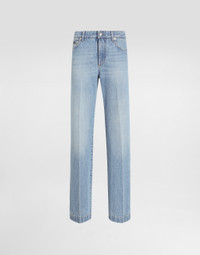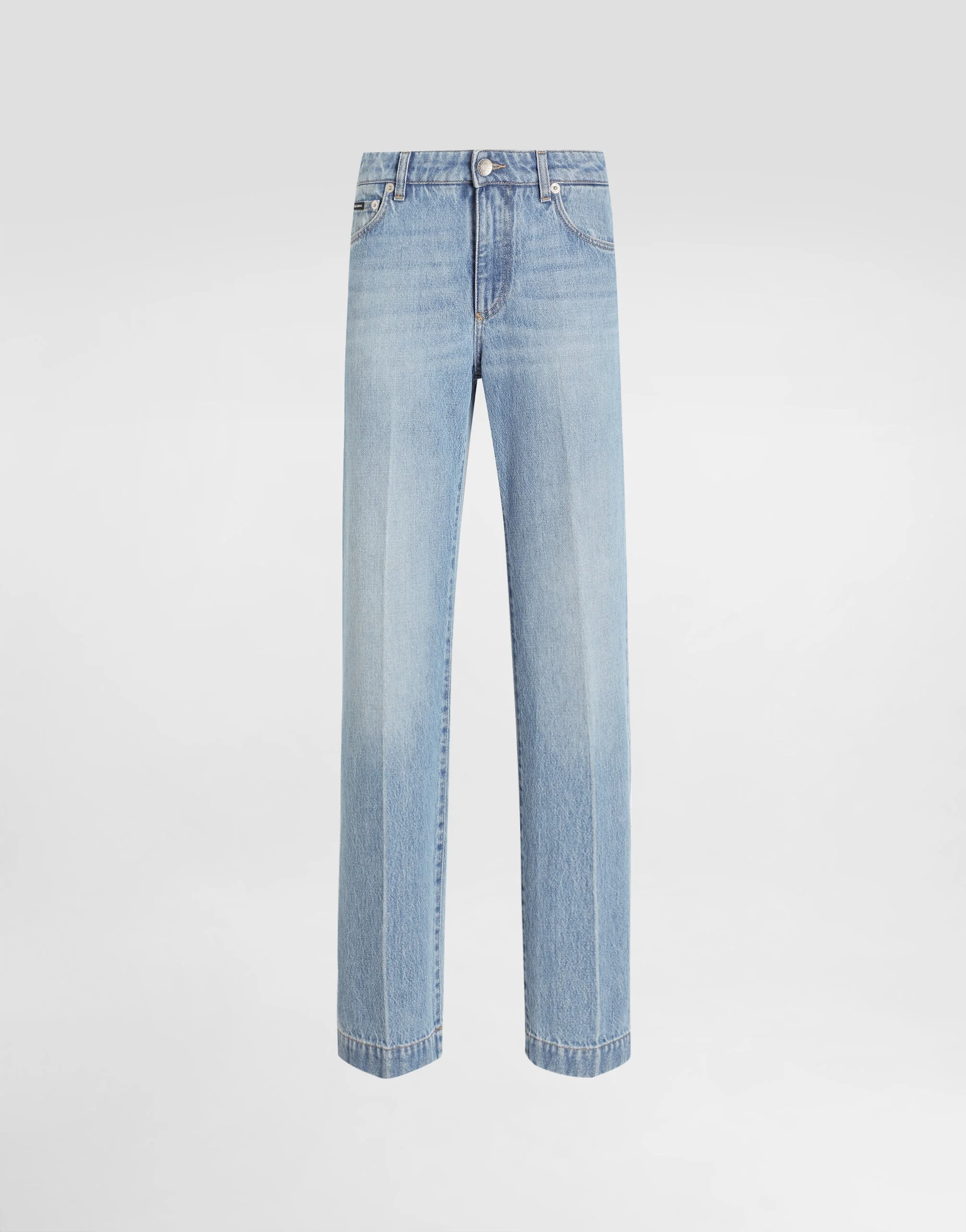 Dolce&Gabbana is conveying a new way of interpreting denim and does so by drawing inspiration from key words such as glamor and signature aesthetic, creating a collection that is perfect for every style and personality, merging femininity, modernity and originality. Loose cotton denim jeans with pressed pleat: • Blue • Low rise • 5 pockets • Branded label on the coin pocket • Branded metal and leather tag on the back pocket • Inner leg: 86 cm • Hem: 23 cm • Zipper and branded metal button fastening • The model is 175 cm tall and wears a size IT 40 • Made in Italy External composition: 100% Cotton