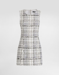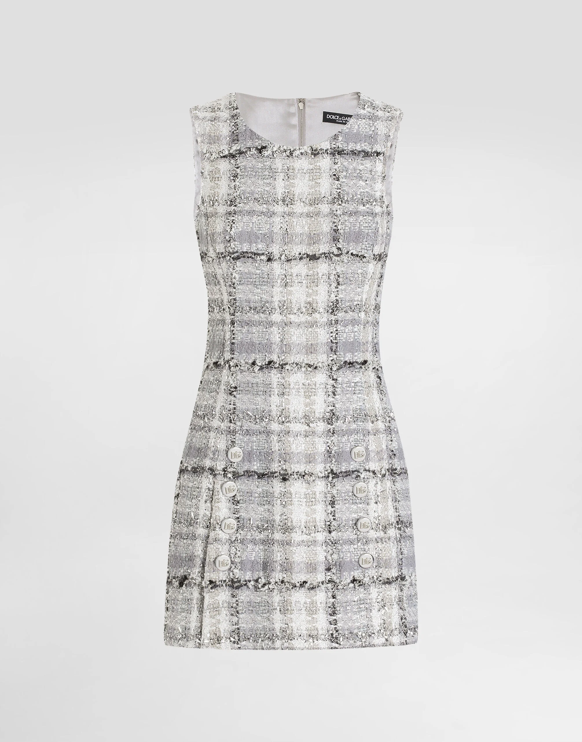The Everyday Women's Collection reimagines contemporary daily wear with Dolce&Gabbana's signature style codes. Iconic fabrics mix with standout details like embroidered flowers, crystals, and jewel buttons, infusing elegance into every look. Gray animal print accented with green and purple, hyper-geometric jewelry, voluminous shapes and transparencies add unique touches. Men's tweed is reinvented with graphic twists, creating distinctive pieces that reflect refined sensuality. Lurex raschel tweed A-line minidress with DG-branded buttons: • Gray • Round neck • Sleeveless • Decorative DG logo buttons • Stretch silk satin lining • Rear zipper and hook-and-bar fastening • The piece measures 41 cm from the waist down on a size IT 40 • The model is 175 cm tall and wears a size IT 40 • Made in Italy External composition: 27% Viscose 19% Wool 16% Polyamide 15% Acrylic 12% Metallic Polyester 08% Polyester 03% Cotton Internal composition: 92% Silk 8% Spandex