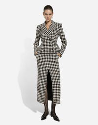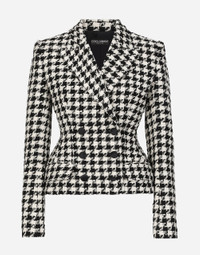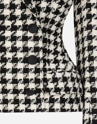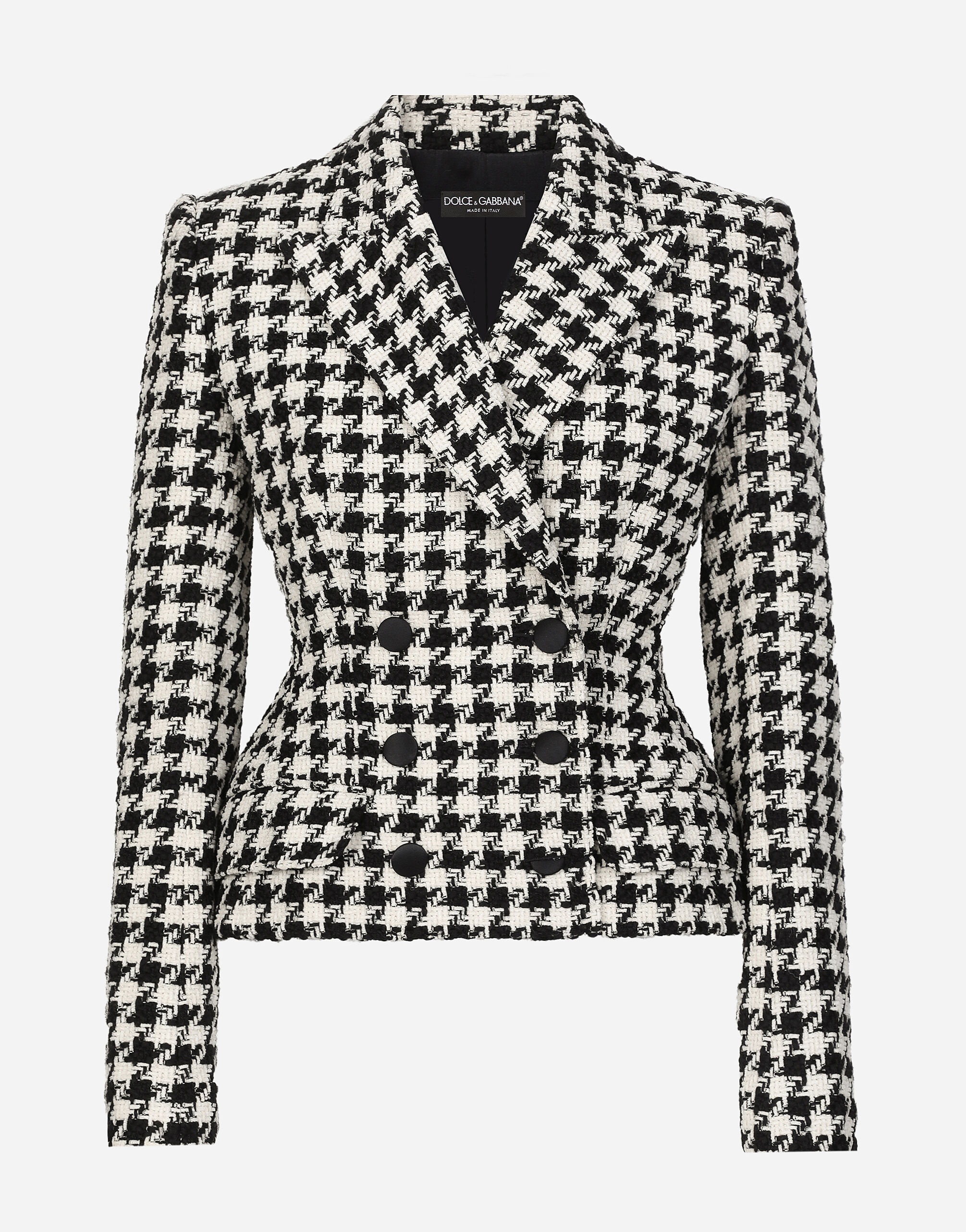 Inspired by 80s fashion photography, the Black Sicily collection masterfully blends masculine and feminine elements, pairing tailored cuts and corset details for the FW 24/25 season. A new vision of the iconic Nero Sicilia black is conveyed through contemporary and sensual looks: jackets and skirts in all-over glen plaid pair with openwork socks, while the 50s-inspired Mun shoes with Eva heel go with the houndstooth Sicily bag featuring crocodile-print leather inserts. Wool macro-houndstooth Dolce jacket: • White and Black • Peak lapels • Long sleeves • Flap pockets • Silk satin lining • Satin-covered button fastenings • The piece measures 57 cm from the center back on a size IT 40 • The model is 175 cm tall and wears a size IT 40 • Made in Italy External composition: 65% Virgin Wool 35% Cotton Internal composition: 100% Silk
