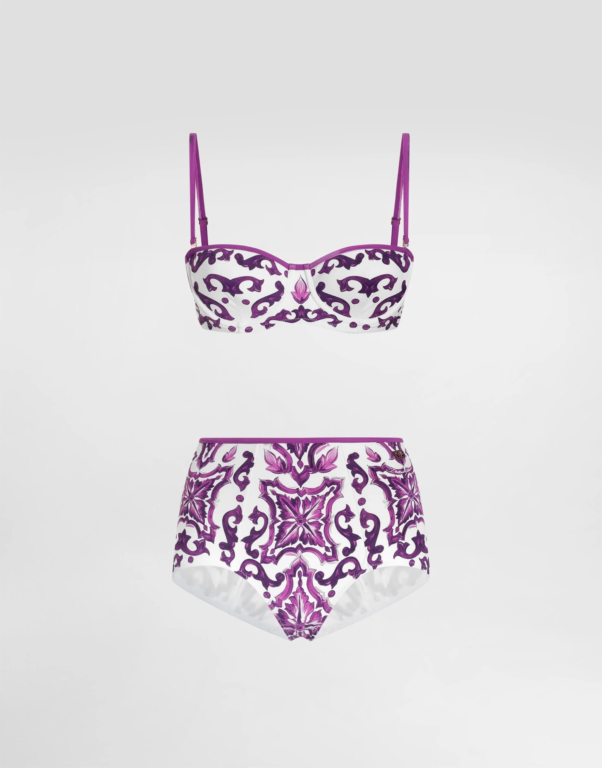 This bikini combines a sophisticated design with unique details, perfect for those who like to stand out in style. Padded bikini with Majolica print: • Multi-coloured • Padded balconette • With detachable straps • High-waisted bottoms • DG metal logo on the hip • Made in Italy The difference in the print placement that you may find on this product is a feature of Dolce&Gabbana’s “Handmade” pieces. A detail that makes every garment or accessory unique and exclusive. External Composition: 74% Polyamide, 26% ElastaneInternal Composition: 88% Polyamide, 12% Elastane