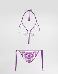 This bikini is a perfect example of craftsmanship and distinctive design, enhancing style and femininity. Triangle bikini in Majolica print: • Multi-coloured • Sliding triangle without underwire • Solid color edging for neckline and side cup • Fixed thong with ends for laces and solid color edging for legging • Made in Italy The difference in the print placement that you may find on this product is a feature of Dolce&Gabbana’s “Handmade” pieces. A detail that makes every garment or accessory unique and exclusive. External Composition: 74% Polyamide, 26% ElastaneInternal Composition: 88% Polyamide, 12% Elastane