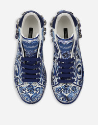 The inspiration for the Blu Mediterraneo Collection is the ancient ceramics of Caltagirone, where tones of white and blue merge in a tribute to Sicilian craftsmanship and majolica tiles, reinterpreted in a contemporary way. These iconic Portofino sneakers come in calfskin nappa. Feminine with bold allure, they feature the iconic majolica print and gemstone embellishment. • Printed calfskin nappa upper • Calfskin heel cup • Flat laces • Calfskin footbed with branded label • Rubber bottom assembly with embellished spoiler • Branded rubber sole • Item comes with themed packaging • Made in Italy External composition: 100% Calfskin Internal composition: 70% Goatskin 20% Lambskin 7% Polyester 3% Natural Rubber