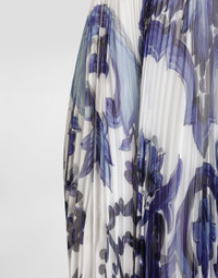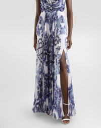 This Majolica print chiffon dress is a design masterpiece that combines elegance and modernity. With its sophisticated cut and neckline that leaves the back bare, it represents a perfect balance between style and boldness. The wide slits and pleated skirt add a touch of movement and lightness, making it ideal for special occasions. Majolica-print chiffon dress: • Multi-colored • Hidden waistband between bodice and skirt • Wide neckline in the back • Pleated skirt with wide slits • Back zip opening • Length from waist of 115 cm on size 40 IT • Separate underskirt with length of 112 cm on size 40 IT • The model is 175 cm tall and wears size 40 IT • Made in Italy The difference in the print placement that you may find on this product is a feature of Dolce&Gabbana’s “Handmade” pieces. A detail that makes every garment or accessory unique and exclusive. External Composition: 100% Polyester