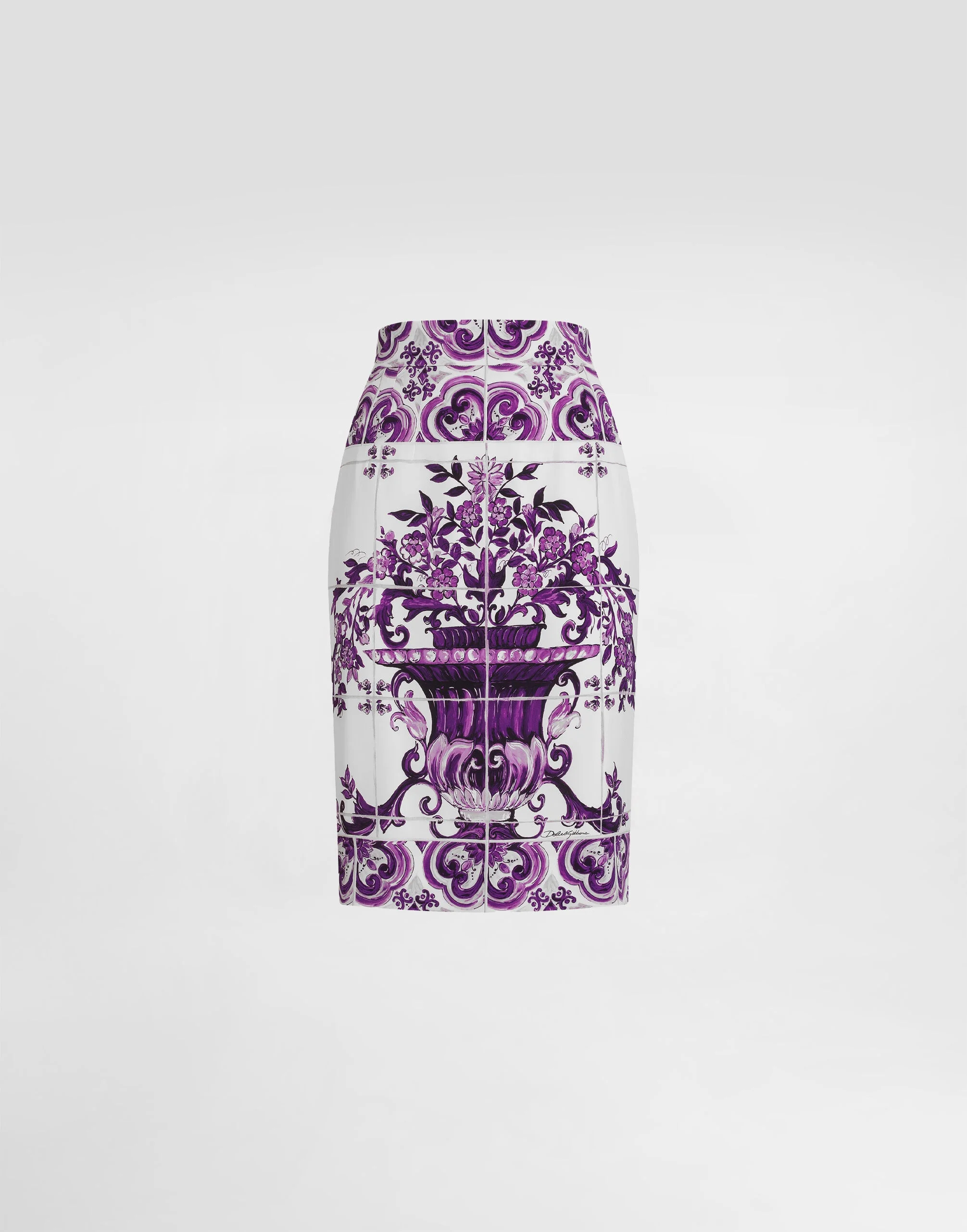 This fitted skirt with Majolica print is an elegant and sophisticated garment, perfect for those who love to stand out with style and originality. Its fitted silhouette and the slit at the center back add a touch of modernity and femininity, making it ideal for special occasions and elegant evenings. Fitted skirt with Majolica print: • Multi-coloured • Fitted with slit at the center back • Covered zip at the center back • 5 cm high belt • Lined • The model is 175 cm tall and wears size 40 IT • Made in Italy The difference in the print placement that you may find on this product is a feature of Dolce&Gabbana’s “Handmade” pieces. A detail that makes every garment or accessory unique and exclusive. External Composition: 94% Silk, 6% ElastaneInternal Composition: 91% Silk, 9% Elastane
