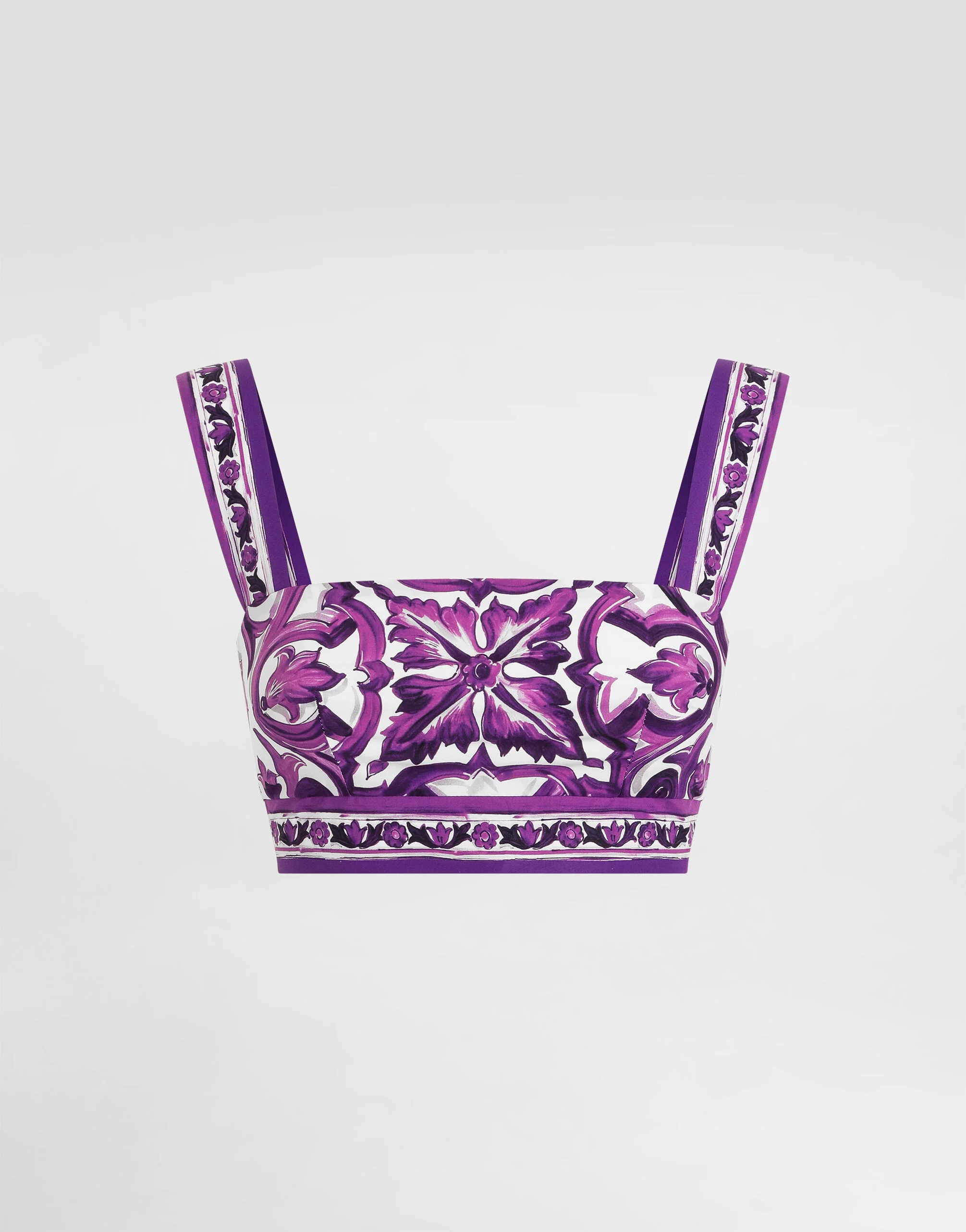This top is an essential item in any woman's wardrobe looking for a fresh and fashionable style. With its Majolica print, it adds a touch of Mediterranean elegance to your look. Poplin top with Majolica print: • Multi-coloured • Straps • Unlined • Opening at the center back with covered zip • Length from shoulder point 13 cm on size 40 IT • The model is 175 cm tall and wears size 40 IT • Made in Italy The difference in the print placement that you may find on this product is a feature of Dolce&Gabbana’s “Handmade” pieces. A detail that makes every garment or accessory unique and exclusive. External Composition: 100% Cotton Internal Composition: 100% Cotton