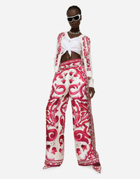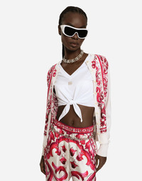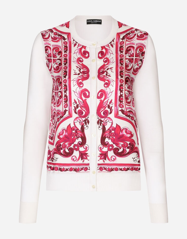 Silk cardigan with Majolica print-embellished silk twill panel on the front: • Multi-colored • 18-gauge knit • Round neck • Long sleeves • Regular fit • Fine-rib trims • Branded mother-of-pearl button fastenings • The piece measures 58 cm from the shoulder seam on a size IT 40 • The model is 175 cm tall and wears a size IT 40 • Made in Italy The difference in the print placement that you may find on this product is a feature of Dolce&Gabbana’s “Handmade” pieces. A detail that makes every garment or accessory unique and exclusive. Care And Details External composition: 100% Silk