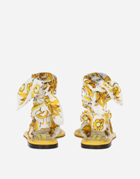 The new collection is inspired by the ancient ceramics of Caltagirone, where tones of white and yellow merge in a tribute to Sicilian craftsmanship and majolica tiles, reinterpreted in a contemporary way. Majolica-print silk twill sandals: • Yellow and white • Printed silk twill laces • Printed kidskin insole with branded label • Branded leather sole • Item comes with a branded dust bag • Made in Italy The difference in the print placement that you may find on this product is a feature of Dolce&Gabbana’s “Handmade” pieces. A detail that makes every garment or accessory unique and exclusive. External composition: 71% Silk 29% Calfskin Internal composition: 100% Goatskin