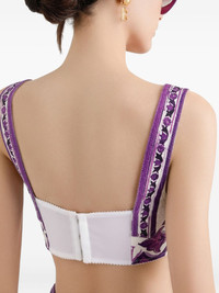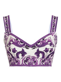 Majolica-print top Highlights - Violet purple - Rear hook fastening - Sweetheart neck - Wide shoulder straps - Cropped Made in Italy Composition Outer: Cotton 33%, Viscose 26%, Polyamide 25%, Linen/Flax 10%, Elastane 6% Lining: Silk 91%, Elastane 9%