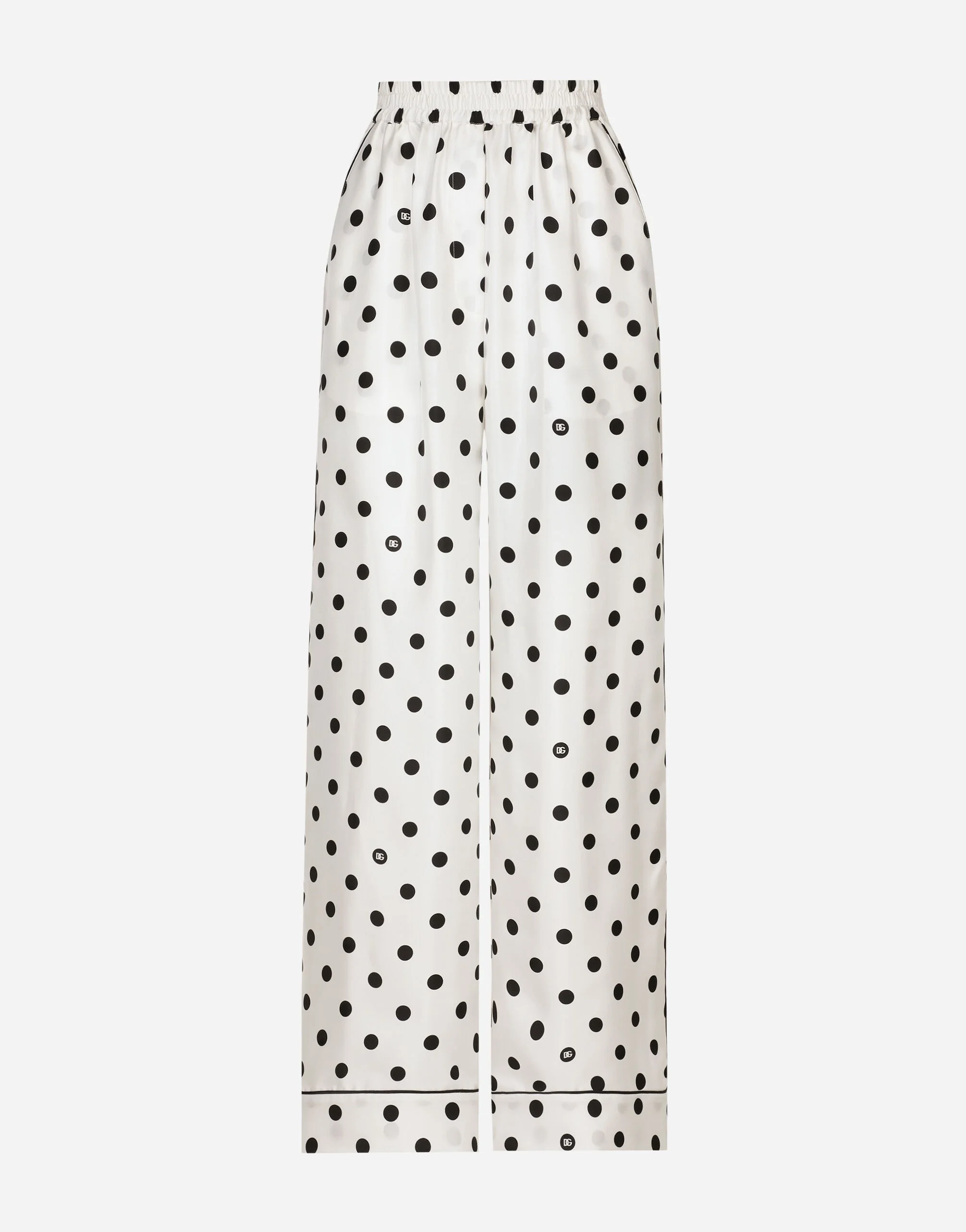 The FW24/25 Mambo Collection is rewriting the rules of Italian elegance, merging the sophisticated style of the 1940s and 1950s with the iconography of American pin-ups. The unmistakable polka-dot motif takes center stage, coming in a variety of shapes and sizes and adorning tulle, charmeuse, twill, silk and poplin, giving life to looks distinguished by black and white accessories and details. An homage to the beauty of Italy and its traditions, the distinctive details of Dolce&Gabbana’s creations. Silk twill pajama pants with polka-dot print: • Black and white • Stretch Dolce high waist •Slant front pockets • Inner leg: 15 cm • Hem: 36 cm • The model is 175 cm tall and wears a size IT 40 • Made in Italy The difference in the print placement that you may find on this product is a feature of Dolce&Gabbana’s “Handmade” pieces. A detail that makes every garment or accessory unique and exclusive. External composition: 100% Silk