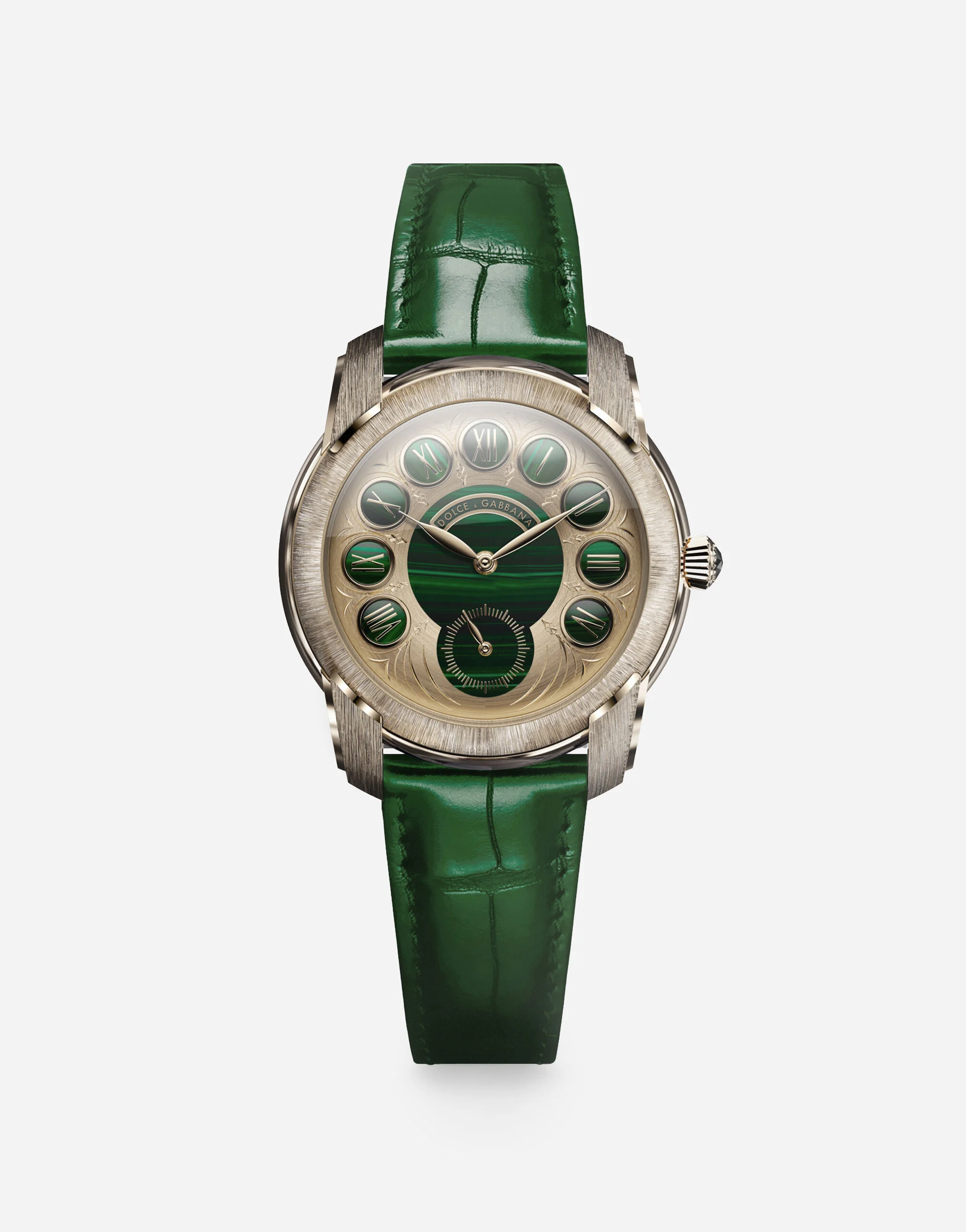 Manifattura Italiana watch in 18-carat rose gold with alligator strap PALERMO WATCH Movement Caliber : DG 01.01 Swiss Made Mechanical Automatic Diameter: 30,50 mm, 4,00 mm height Number of jewels: 30 jewels Case Material: 18 kt rose gold Diameter: 42,5 mm Glass: sapphire Water resistance: 3 BAR Dial 18 kt rose gold with malachite Hands: galvanized brass rose gold Green alligator strap with deployant clasp in 18 kt rose gold 18 kt rose gold POST-SALE WATCH MAINTENANCE To maintain the brilliance of the watch and metal bracelet, we recommend using mild soap and rinsing thoroughly with warm water. Dry with a soft cloth. We recommend this being done also after a swim in the sea or pool. It is advisable to avoid direct contact with solvents, detergents, perfumes and cosmetic products, which might damage the case, seals, bracelet and/or strap. It is advisable to protect the watch from falls and shocks, which could not only seriously damage the finish, but might affect the mechanical functions also, as well as the water resistance and accuracy of the watch. After adjustments, it is recommended to always push the crown firmly against the case to prevent water or dust from entering the mechanism. The watch is water resistant up to 3?BAR / 3?ATM. This means it has been tested under underwater pressure equivalent to a depth of 20 meters. The watch should never be used for sports involving a high risk of impact (such as surfing, water skiing, etc.). Leather straps are not suitable for activities involving water. When the watch is wet, do not pull out the crown, as water could enter the case. Temperatures above 60°C/140°F and below -10°C/14°F , sudden changes in pressure, density and temperature, magnetic fields, and many other factors can affect the accuracy of the watch, we recommended to avoid placing the watch next to objects which could generate strong magnetic fields, such as loudspeakers and electric motors. If you note any irregularities in operation, the watch should be taken to an authorised Dolce&Gabbana retailer.