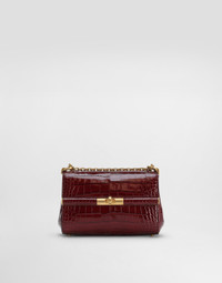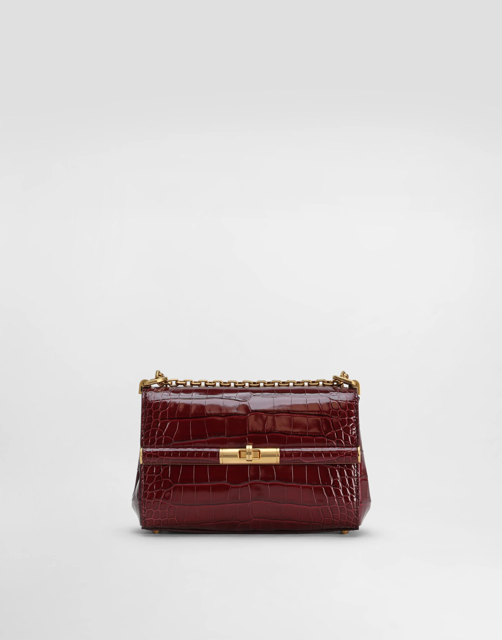 The Marlene bag, made of polished alligator, is a luxury accessory that combines elegance and functionality. Perfect for the modern woman, it stands out for its vintage brass finish. Marlene City Mini bag in polished Alligator: • Bordeaux • Fixed metal chain shoulder strap • Vintage brass plating • External customization with swivel and stamp with film • Interior with logoed and customizable plate, flat pocket • Item equipped with logoed bag, logoed box and pre-assembled box • Measurements: H10.5 x W18 x D7 cm • Made in Italy External Composition: 100% Alligator Leather Internal Composition: 100% Lambskin