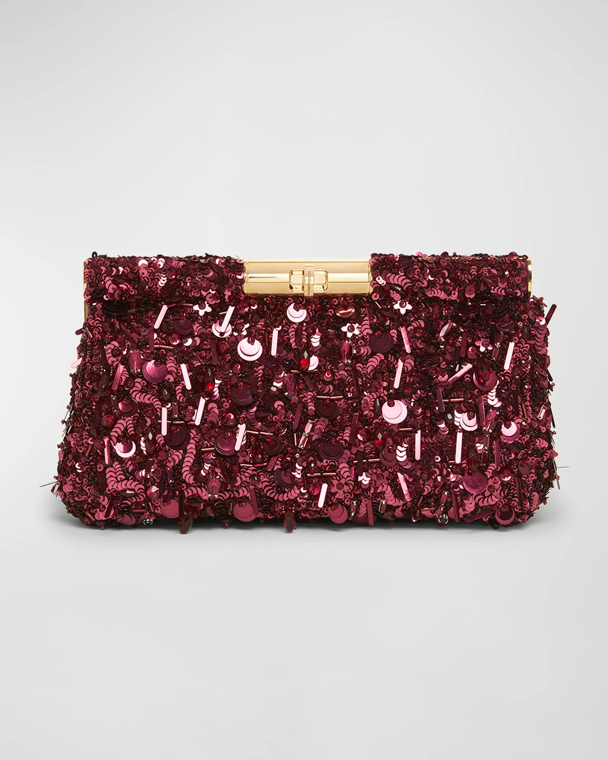 - Dolce&Gabbana "Marlene" clutch bag in sequined acrylic, glass, and ProModal® rayon - Embellished chain shoulder strap - Can be worn as a clutch or shoulder bag - Structured top with turn-lock closure - Interior, one slip pocket - Approx. 6"H x 9"W x 2"D - Made in Italy