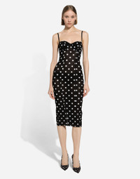 The FW24/25 Mambo Collection is rewriting the rules of Italian elegance, merging the sophisticated style of the 1940s and 1950s with the iconography of American pin-ups. The unmistakable polka-dot motif takes center stage, coming in a variety of shapes and sizes and adorning tulle, charmeuse, twill, silk and poplin, giving life to looks distinguished by black and white accessories and details. An homage to the beauty of Italy and its traditions, the distinctive details of Dolce&Gabbana’s creations. Marquisette sheath dress with polka-dot print and corset details: • Black and White • Sweetheart neckline • Sleeveless with adjustable shoulder straps • Lined in stretch marquisette • Rear zipper and hook-and-eye fastening • The piece measures 75 cm from the waist down on a size IT 40 • The model is 175 cm tall and wears a size IT 40 • Made in Italy The difference in the print placement that you may find on this product is a feature of Dolce&Gabbana’s “Handmade” pieces. A detail that makes every garment or accessory unique and exclusive. External composition: 84% Polyamide 16% Spandex Internal composition: 75% Polyamide 25% Spandex