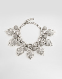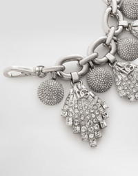 The Everyday Women's Collection reimagines contemporary daily wear with Dolce&Gabbana's signature style codes. Iconic fabrics mix with standout details like embroidered flowers, crystals, and jewel buttons, infusing elegance into every look. Gray animal print accented with green and purple, hyper-geometric jewelry, voluminous shapes and transparencies add unique touches. Men's tweed is reinvented with graphic twists, creating distinctive pieces that reflect refined sensuality. Maxi-necklace with chain, rhinestones accents and the DG logo: • Palladium • Length: 33 + 14 cm • Clasp fastening • Nickel-free and hypoallergenic materials • Engraved logo • Made in Italy Composition: 70% Brass 25% Glass 5% Zamak
