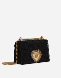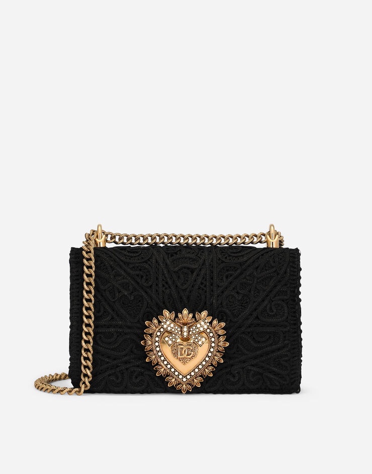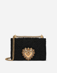 This medium Devotion bag comes in fine cordonetto lace and embodies Sicilian tradition and represents the brand’s signature aesthetic. It features the exclusive bejeweled heart fastening with vintage gold finish and the shoulder strap inspired by the techniques of high-quality jewelers: • Adjustable chain strap • Front flap with bejeweled branded heart hand-tooled from a metal alloy with pearl inlay • Concealed press-stud fastening • Nappa leather lining with a pocket with a zipper featuring a Devotion slider • Item comes with a branded dust bag • Measurements: 14.5 x 21 x 3 cm • Made in Italy Care And Details External composition: 100% Cotton Internal composition: 95% Lambskin 5% Viscose