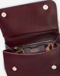 Medium dauphine leather handbag from the Sicily line. • Front flap with hidden press-stud closure and front logoed galvanic plaque • On top handle with removable and adjustable leather strap • Cotton leopard print inner • Internal zip-up pocket and smartphone pocket • Metal bag feet on the base • Item equipped with logoed dust bag • Measurement. 26 x 21 x 12 cm Care And Details External Composition: 100% Calfskin Internal Composition: 80% Cotton 20% Calfskin