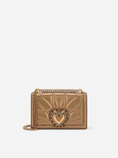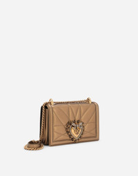 Straight off the catwalk, the Devotion Bag is the new hot item. Fashioned with a love for artisan craftsmanship and attention to detail, the bag is embellished by the transcendent symbol of love: the Cuore Sacro. Medium cross-body bag from the Devotion line in quilted nappa mordoré leather: • Sliding cross-body strap in chain and nappa leather inspired by the high jewelry workmanship • Front flap with handmade branded heart jewel in metal alloy with pearl inlays • Closure with concealed pressure clasp • Internal pocket featuring zipper with Devotion logo glider • Nappa leather interior embellished by a heart • Item comes with Dust Bag and special packaging • Dimensions: 21 x 14.5 x 3 cm – 8.3 x 5.7 x 1.2 inches • Made in Italy Care And Details External composition: 100% Nappa Leather Internal composition: 100% Nappa Leather