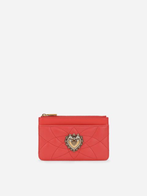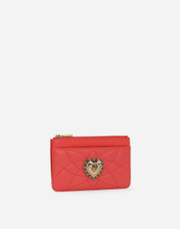 Practical and compact, this Devotion card holder comes in soft quilted nappa leather. Featuring a practical accordion compartment with top zip, it features exclusive finishes and the iconic bejeweled branded heart in a metal alloy embellished with pearl inlay. Medium Devotion card holder in quilted nappa leather: • Red • Five card slots and one flat pocket on the back • Flat front pocket • Top coin pocket with zipper and branded slider • Measurements: H9 x W14 x D1 cm • Made in Italy External composition: 100% Lambskin Internal composition: 100% Viscose