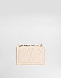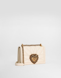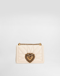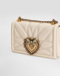 This medium Devotion bag comes in quilted nappa leather. It features the exclusive bejeweled heart fastening with vintage gold finish and the shoulder strap inspired by the techniques of high-quality jewelers. Medium Devotion bag in quilted nappa leather: • Cream • Front flap with bejeweled branded heart made from hand-tooled metal alloy with pearl inlay • Concealed press-stud fastening • Adjustable chain shoulder strap with nappa leather insert so it can be worn over the shoulder or across the body • Nappa leather lining featuring a pocket with zipper and Devotion slider • Packaging matches the item • Measurements: H14.5 x W21 x D3 cm • Made in Italy External composition: 100% Lambskin Internal composition: 100% Lambskin