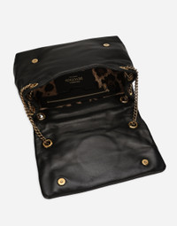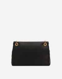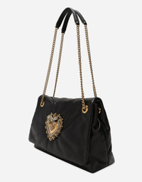 Featuring soft, deconstructed lines, this Devotion Soft bag comes in 100% soft nappa leather. It boasts a sliding chain strap inspired by an exclusive bejeweled heart clasp with a vintage gold finish. Medium Devotion Soft bag in nappa leather: • Black • Front flap with bejeweled branded heart made from a metal alloy with pearly ABS inlay • Concealed double magnetic fastening • Sliding chain strap with calfskin inserts • Printed fabric lining with zipped pocket and a card slot compartment • Item comes in themed packaging • Measurements: H17 x W28 x D9 cm • Made in Italy External composition: 100% Lambskin Internal composition: 75% Cotton 25% Lambskin