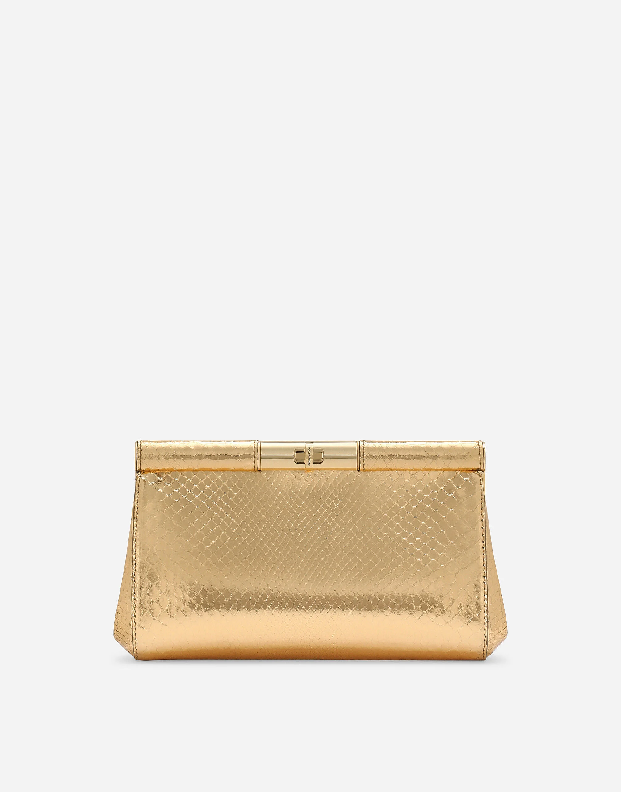 Iconic and timeless, this new Marlene bag comes entirely in foiled python skin with a chain strap. Medium foiled python skin Marlene bag: • Gold • Turn-lock • Chain strap • Nappa leather lining and flat pocket • Item comes with a branded dust bag • Measurements: H14 x W23 x D4.5 cm • Made in Italy External composition: 100% Python Molurus Internal composition: 100% Lambskin