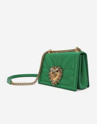 This medium Devotion bag comes in quilted nappa leather. It features the exclusive bejeweled heart fastening with vintage gold finish and the shoulder strap inspired by the techniques of high-quality jewelers. Medium Devotion bag in quilted nappa leather: • Green • Front flap with bejeweled branded heart made from hand-tooled metal alloy with pearl inlay • Concealed press-stud fastening • Adjustable chain shoulder strap with nappa leather insert so it can be worn over the shoulder or across the body • Nappa leather lining featuring a pocket with zipper and Devotion slider • Item comes in themed packaging • Measurements: H14.5 x W21 x D3 cm • Made in Italy External composition: 100% Lambskin Internal composition: 100% Lambskin