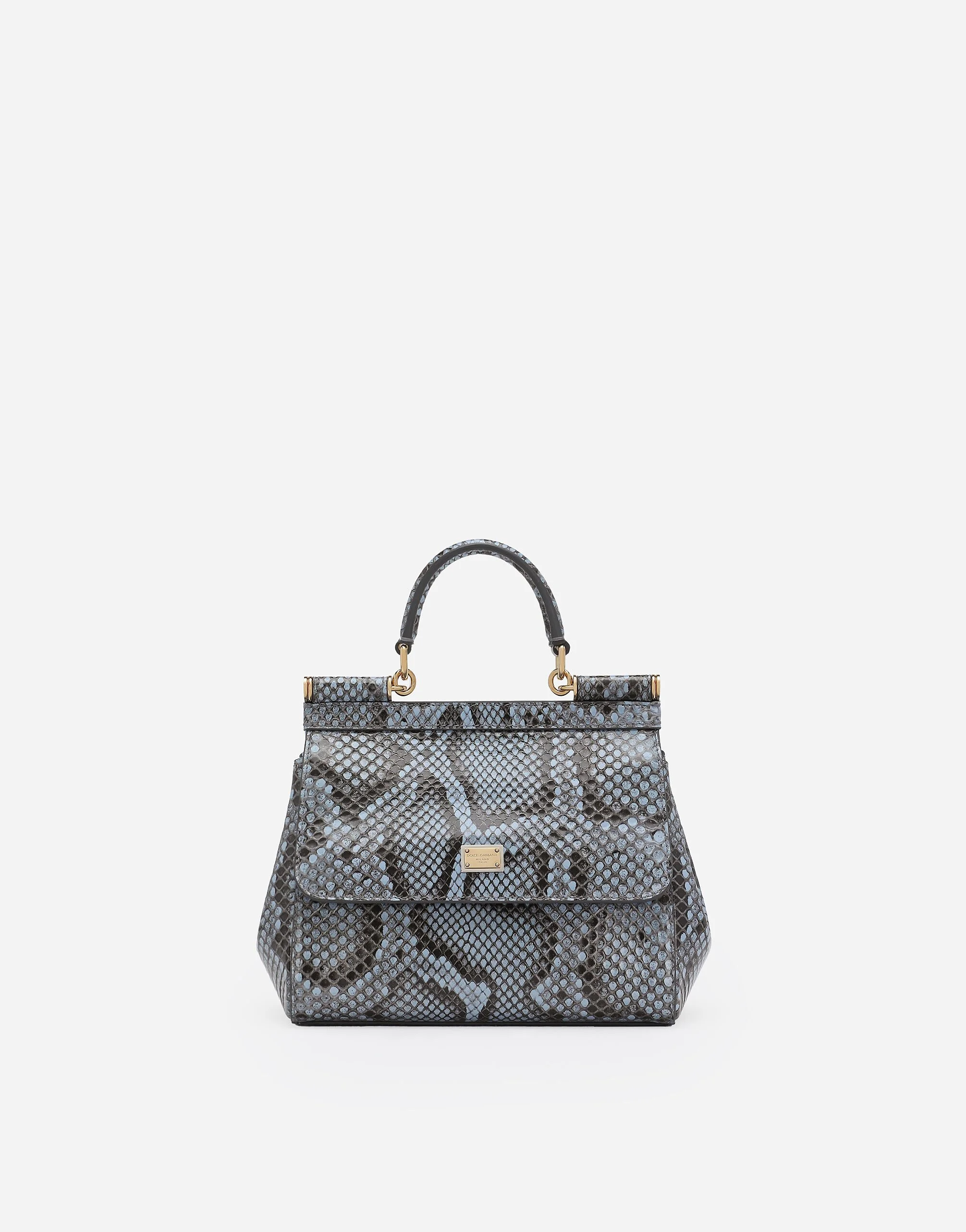 The brand icon par excellence, this medium Sicily bag comes in python skin. Understated and feminine, it features the branded tag featuring two metal plating finishes. Medium python skin Sicily handbag: • Light blue • Front flap with hidden double magnetic fastening • Branded tag featuring two metal plating finishes • Top handle and adjustable, detachable strap in python skin • Nappa leather lining • Inner pocket and card slots • Item comes with a branded dust bag • Measurements: H18.5 x W20 x D10 cm • Made in Italy External composition: 100% Python Molurus Internal composition: 100% Lambskin