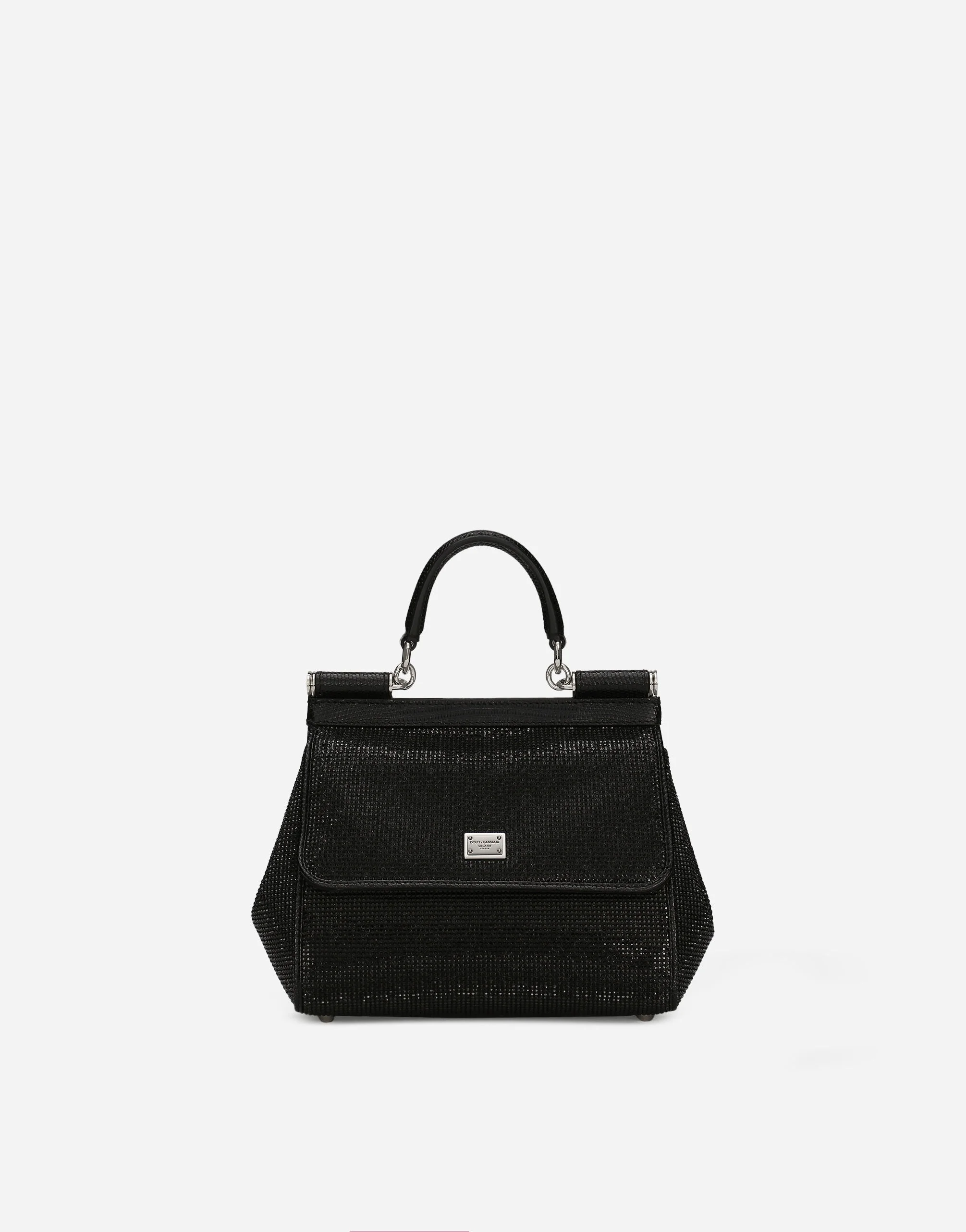 The fusion and alchemy between the history and creativity of D&G’s designers and the contemporary vision of Kim Kardashian, style and beauty icon, lie at the heart of the new Runway collection. The brand’s origins and invaluable archives have been reworked and reinterpreted to imbue Dolce&Gabbana’s signature style with new life. Medium Sicily bag in satin with all-over rhinestones and the palladium-plated metal logo tag: • Black • Front flap with hidden double magnetic fastening • Logo tag featuring two metal plating finishes • Top handle and adjustable, detachable strap in calfskin • Printed fabric lining • Inner pocket • Item comes with a branded dust bag • Measurements: H18.5 x W20 x D10 cm • Made in Italy External composition: 55% Viscose 25% Silk 20% Calfskin Internal composition: 50% Viscose 25% Silk 10% Calfskin 10% Polyamide 5% Polyurethane