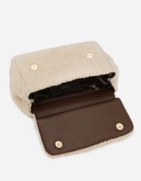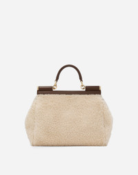 The brand icon par excellence, this large Sicily bag comes in soft faux fur and calfskin. Understated and feminine, it comes with the logo tag featuring two metal plating finishes. Large faux fur Sicily bag: • Cream • Front flap with hidden double magnetic fastening • Logo tag featuring two metal plating finishes • Top handle and adjustable, detachable strap in calfskin • Printed fabric lining • Inner pocket with branded zipper and a cell phone holder • Metal feet studs on the base • Item comes with a branded dust bag • Measurements: H22 x W25 x D12 cm • Made in Italy External composition: 70% Polyester 30% Calfskin Internal composition: 80% Cotton 20% Calfskin