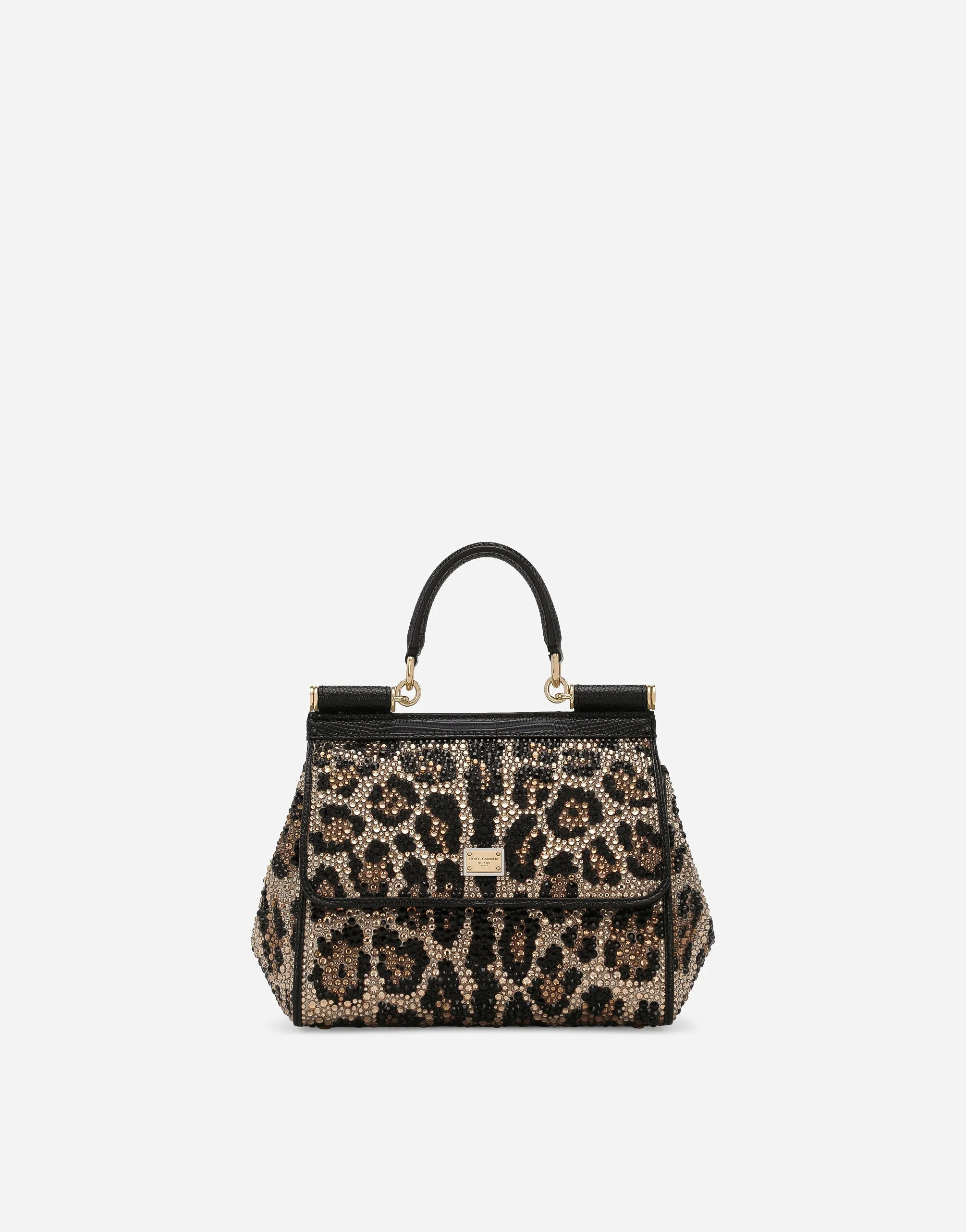 The brand icon par excellence, this medium Sicily bag comes in leopard-print satin with all-over rhinestone embellishment that creates the motif. Understated and feminine, it comes with the logo tag featuring two metal plating finishes. Medium satin Sicily bag with fusible rhinestone embellishment: • Leopard print • Front flap with hidden double magnetic fastening • Logo tag featuring two metal plating finishes • Top handle and adjustable, detachable strap in iguana-print calfskin • Printed fabric lining • Inner pocket • Item comes with a branded dust bag • Measurements: H18.5 x W20 x D10 cm • Made in Italy External composition: 85% Polyester 15% Calfskin Internal composition: 60% Viscose 20% Silk 10% Calfskin 10% Polyester