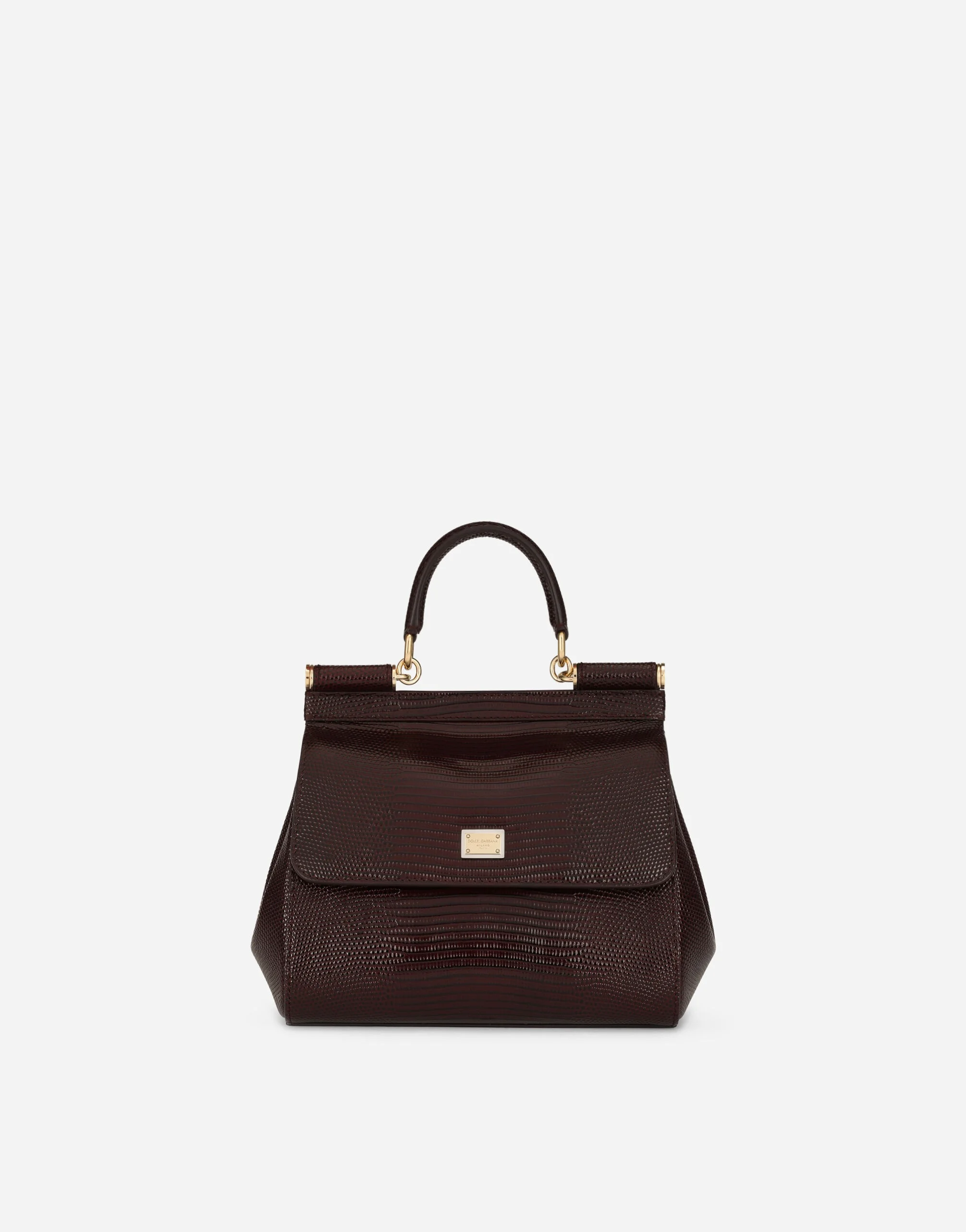 The brand icon par excellence, this medium Sicily bag comes in pop colors. Featuring an understated and feminine shape, this Sicily bag comes in calfskin. Medium Sicily bag in iguana-print calfskin: • Burgundy • Front flap with hidden double magnetic fastening • Logo tag featuring two metal plating finishes • Top handle and adjustable, detachable strap in calfskin • Printed fabric lining • Inner pocket • Item comes with a branded dust bag • Measurements: H18.5 x W20 x D10 cm • Made in Italy External composition: 100% Calfskin