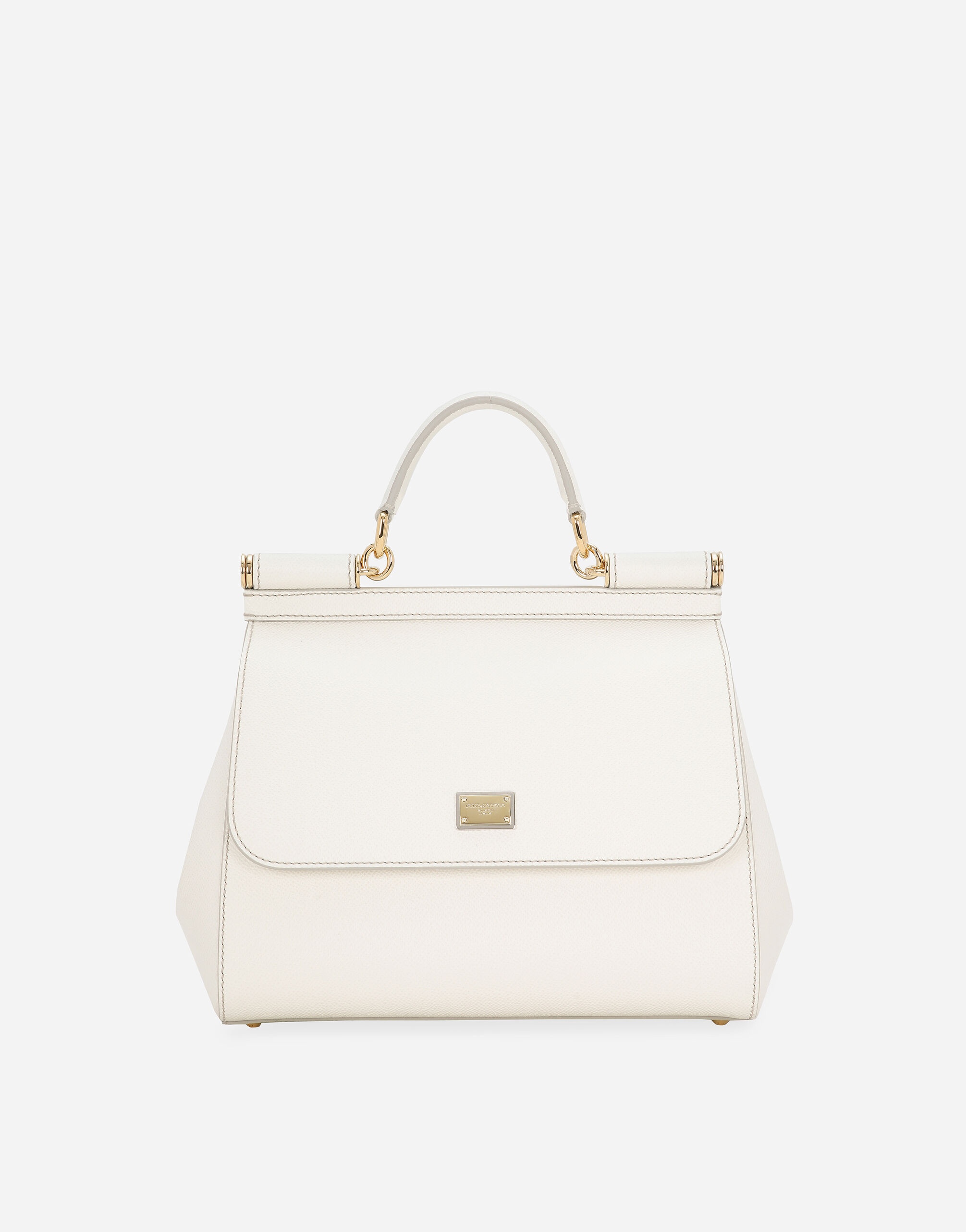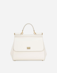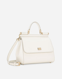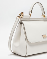 The brand icon par excellence; this large Sicily bag comes in Dauphine calfskin. Understated and feminine; it comes with the logo tag featuring two metal plating finishes. Medium handbag from the Sicily line in Dauphine leather. • Front flap with hidden snap closure and galvanic logo plate in the front • Top handle and adjustable and removable leather shoulder strap • Cotton interior with Leo print • Internal zip pocket and smartphone pocket • Metal studs on the bottom • Comes with logoed Dust Bag • Measurements. 26 x 21 x 12 cm • Made in Italy External composition: 100% Calfskin Internal composition: 80% Cotton 20% Calfskin