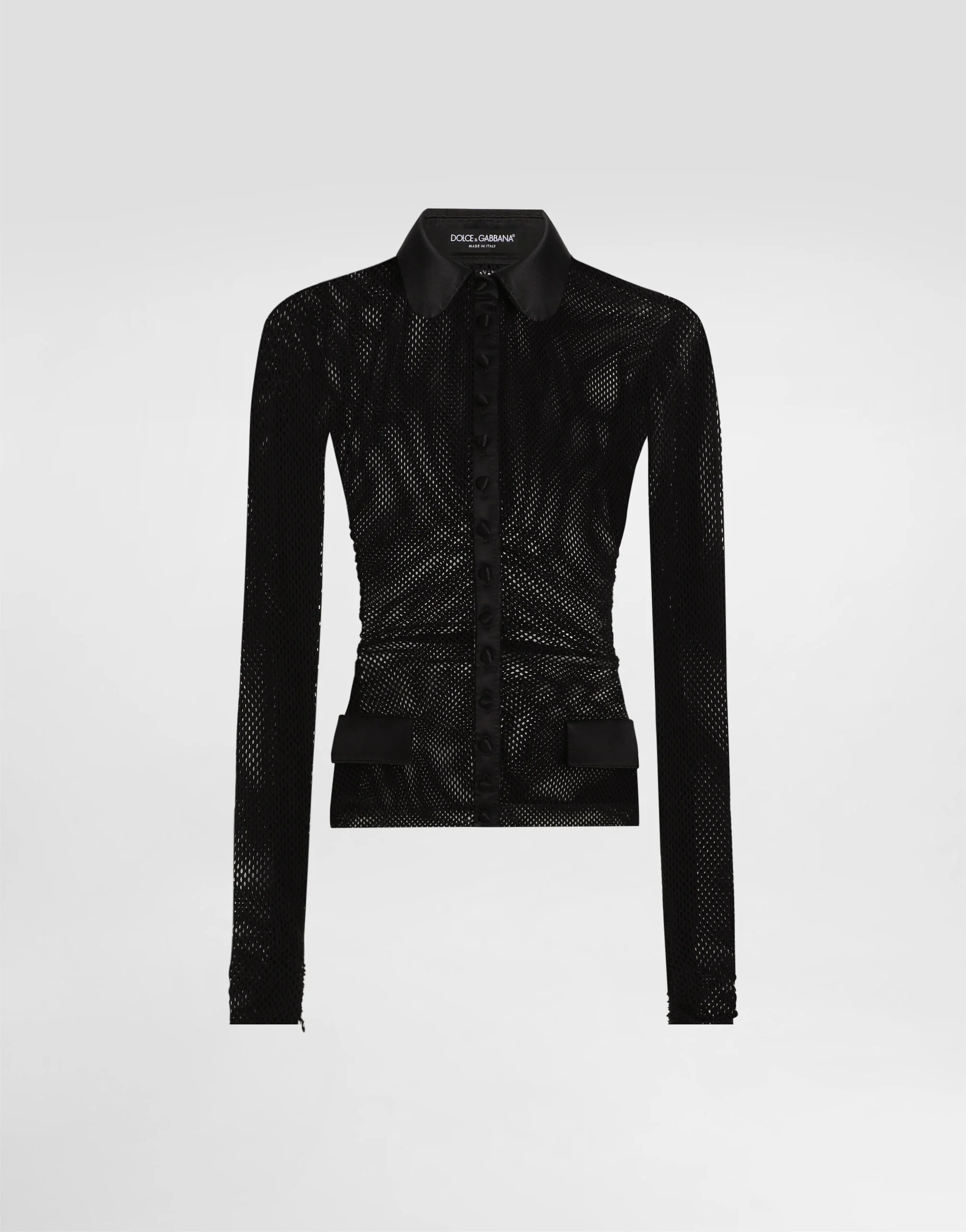 The Spring/Summer 2025 Women’s Collection is celebrating Italian beauty through bold and charismatic femininity. The 50s-inspired lingerie is the star, intermingling with fitted dresses, corsets and oversize trench coats. The iconic jackets have been updated with cropped cuts and modern inserts, while the floral prints add a romantic edge. The eveningwear shines with light fabrics and crystals, accompanied by look-defining accessories, from iconic bags to the cross earrings. Mesh shirt jacket: • Black • Shirt collar • Long sleeves • Fitted with side draping • Faux pockets • Unlined • Button fastenings • The piece measures 54 cm from the center back on a size IT 40 • The model is 175 cm tall and wears a size IT 40 • Made in Italy External composition: 69% Polyamide 20% Silk 06% Polyester 05% Spandex