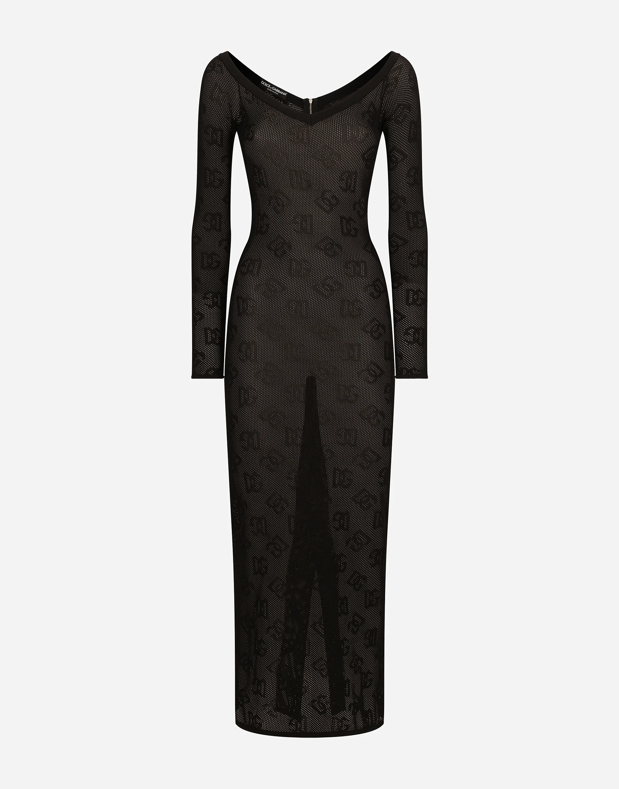 The DNA collection is distinguished by timeless shapes, bringing together three concepts: Sicilian flair, tailoring and sensuality. Nero Sicilia black and optical white predominate and pair with colors that catapult us onto the island of Sicily and make us dream. The designers channel the timeless wardrobe made up of creations that are instantly unmistakable in their simplicity, presenting us with sophisticated beauty loaded with meaning and symbolism that transcends fashion. Mesh-stitch sheath dress with jacquard DG logo: • Black • 18-gauge knit • V-neck • Covered rear slit • Form fitting • Unlined • Zipper and hook-and-eye fastening • The piece measures 132 cm from the shoulder seam on a size IT 40 • The model is 175 cm tall and wears a size IT 40 • Made in Italy External composition: 83% Viscose 17% Polyester