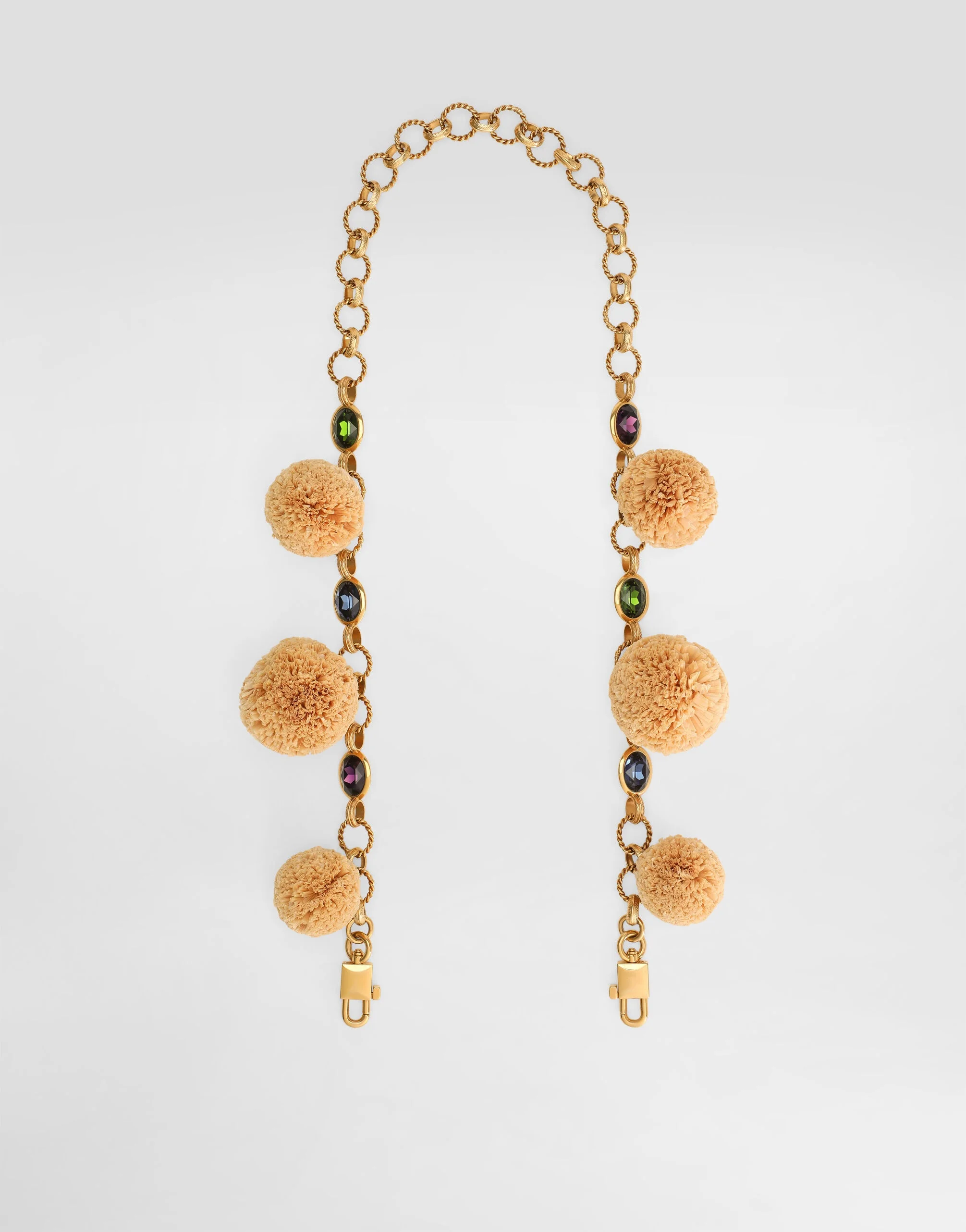 This bezel-set metal shoulder strap is a signature accessory that adds a touch of elegance and originality to any bag. Metal bag shoulder strap with bezels: • Multi-coloured • Vintage brass electroplating clasp • External customization with metal engraving • Special processes in rafia crochet • Item equipped with a logoed box • Length: 90 cm • Made in Italy External Composition: 60% Brass, 15% Glass, 10% Viscose, 10% Zamak, 5% Steel
