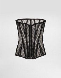 The Women's Black Sicily Collection reinforces Dolce&Gabbana's iconic fabrics and codes rooted in Italian heritage. Sensual silhouettes, highlighted by floral prints and refined corsetry, evoke an intriguing elegance, while the iconic black lace, satin, and velvet dominate the collection. Denim in various shades of blue introduces a contemporary twist, balancing the classic and modern. Embroidered crosses, medals, and jewelry add a sophisticated touch. Mesh tulle corset: • Black • Straight neckline • Metal boning • Zipper fastening at the back • The piece measures 34 cm from the center front on a size IT 40 • The model is 175 cm tall and wears a size IT 40 • Made in Italy External composition: 41% Polyamide 39% Cotton 20% Polyester