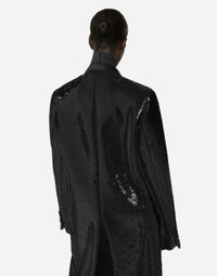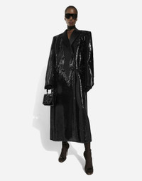 Micro-sequined double-breasted coat: • Black • Duchesse silk peak lapels • Long sleeves • Loose fit • Stretch silk satin lining • Covered button fastenings • The piece measures 125 cm from the center back on a size IT 40 • The model is 175 cm tall and wears a size IT 40 • Made in Italy Care And Details External composition: 49% Viscose 49% Polyester 2% Elastodiene Internal composition: 92% Silk 8% Spandex