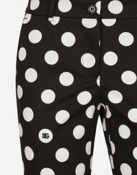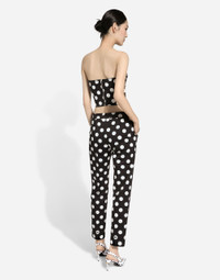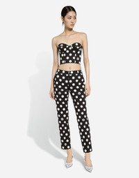 The FW24/25 Mambo Collection is rewriting the rules of Italian elegance, merging the sophisticated style of the 1940s and 1950s with the iconography of American pin-ups. The unmistakable polka-dot motif takes center stage, coming in a variety of shapes and sizes and adorning tulle, charmeuse, twill, silk and poplin, giving life to looks distinguished by black and white accessories and details. An homage to the beauty of Italy and its traditions, the distinctive details of Dolce&Gabbana’s creations. Cotton drill pants with polka-dot print: • Black and White • Regular rise • Slant front pockets • Inner leg: 74 cm • Hem: 16.5 cm • The model is 175 cm tall and wears a size IT 40 • Made in Italy The difference in the print placement that you may find on this product is a feature of Dolce&Gabbana’s “Handmade” pieces. A detail that makes every garment or accessory unique and exclusive. External composition: 97% Cotton 03% Spandex